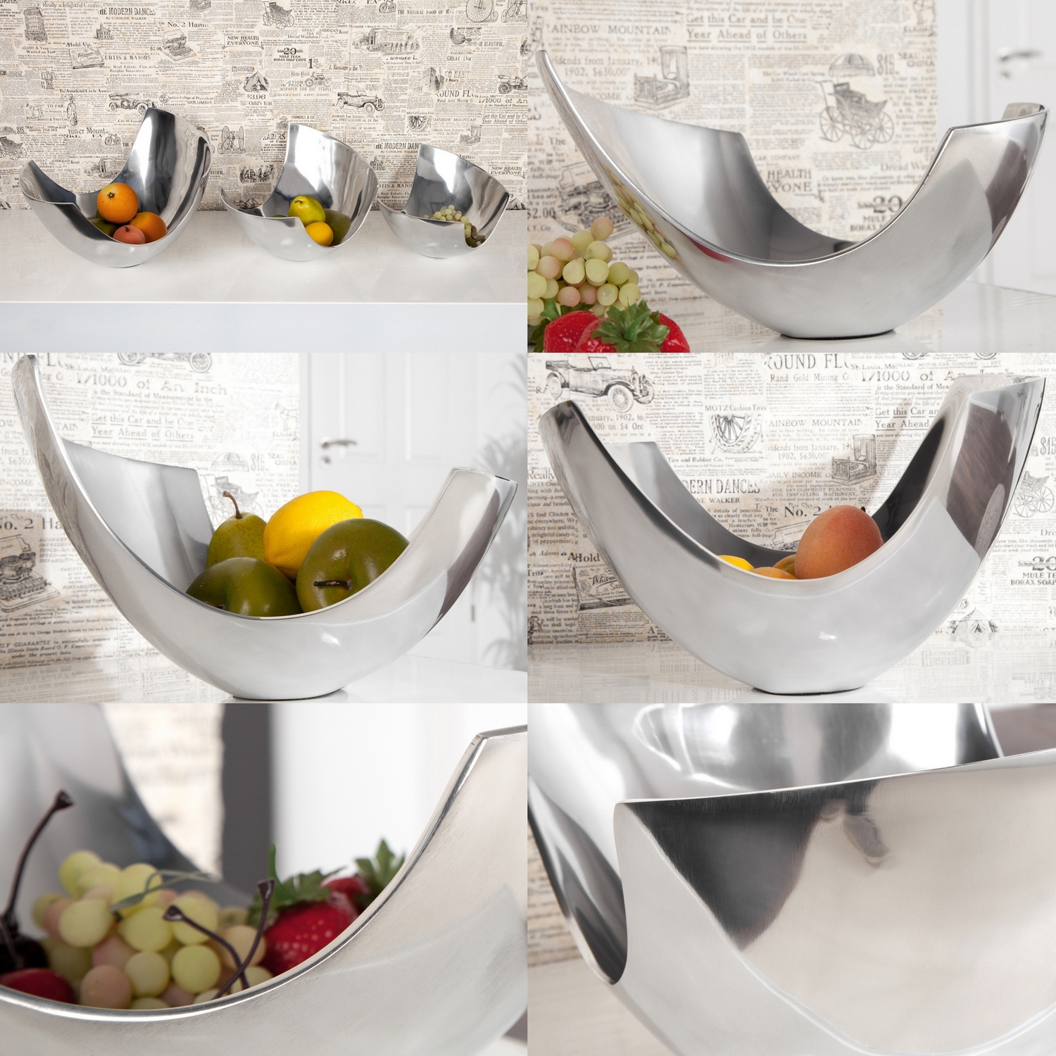 Die außergewöhnliche Design Obstschale CLEO Silber aus poliertem Aluminium ist in drei Größen lieferbar (siehe Fotos):