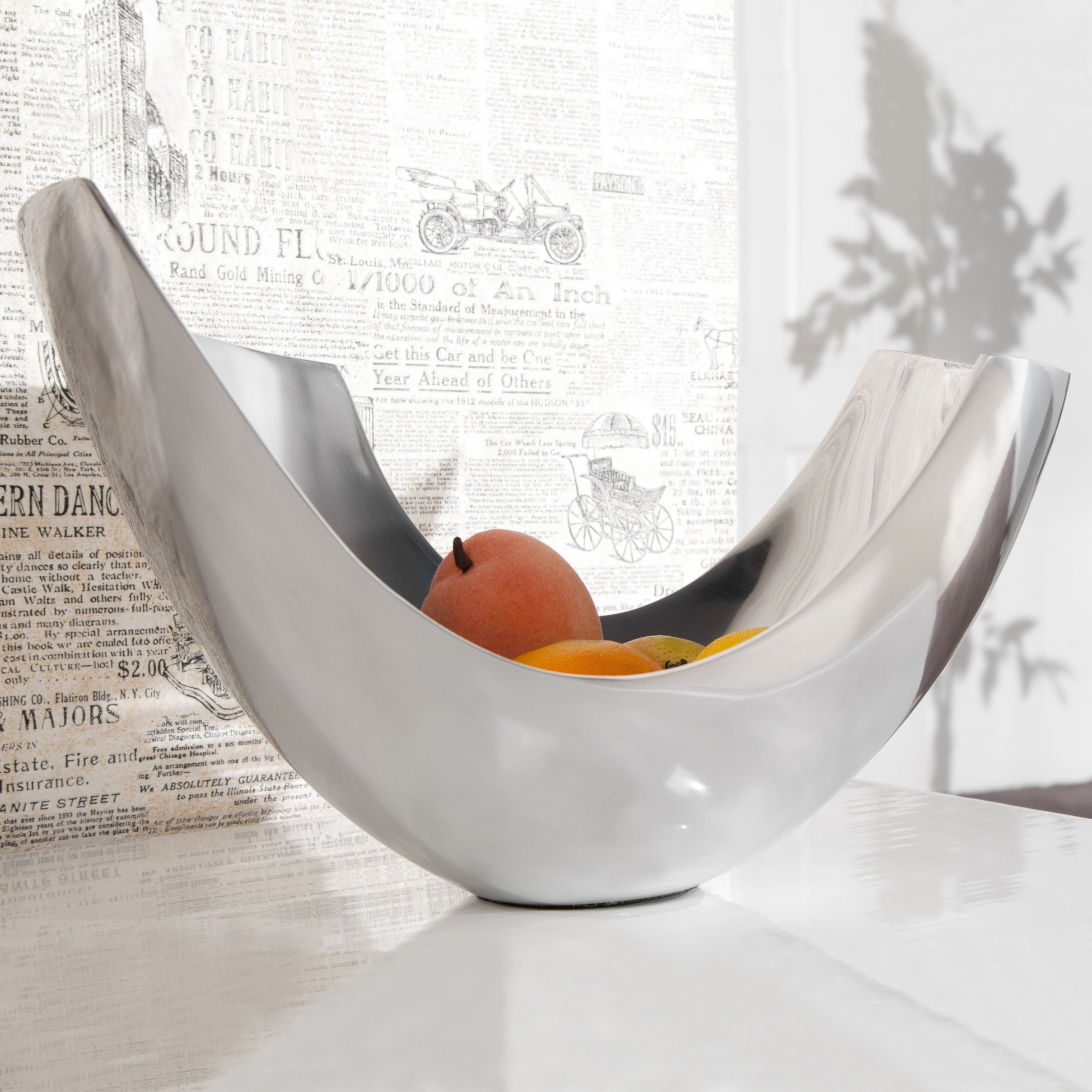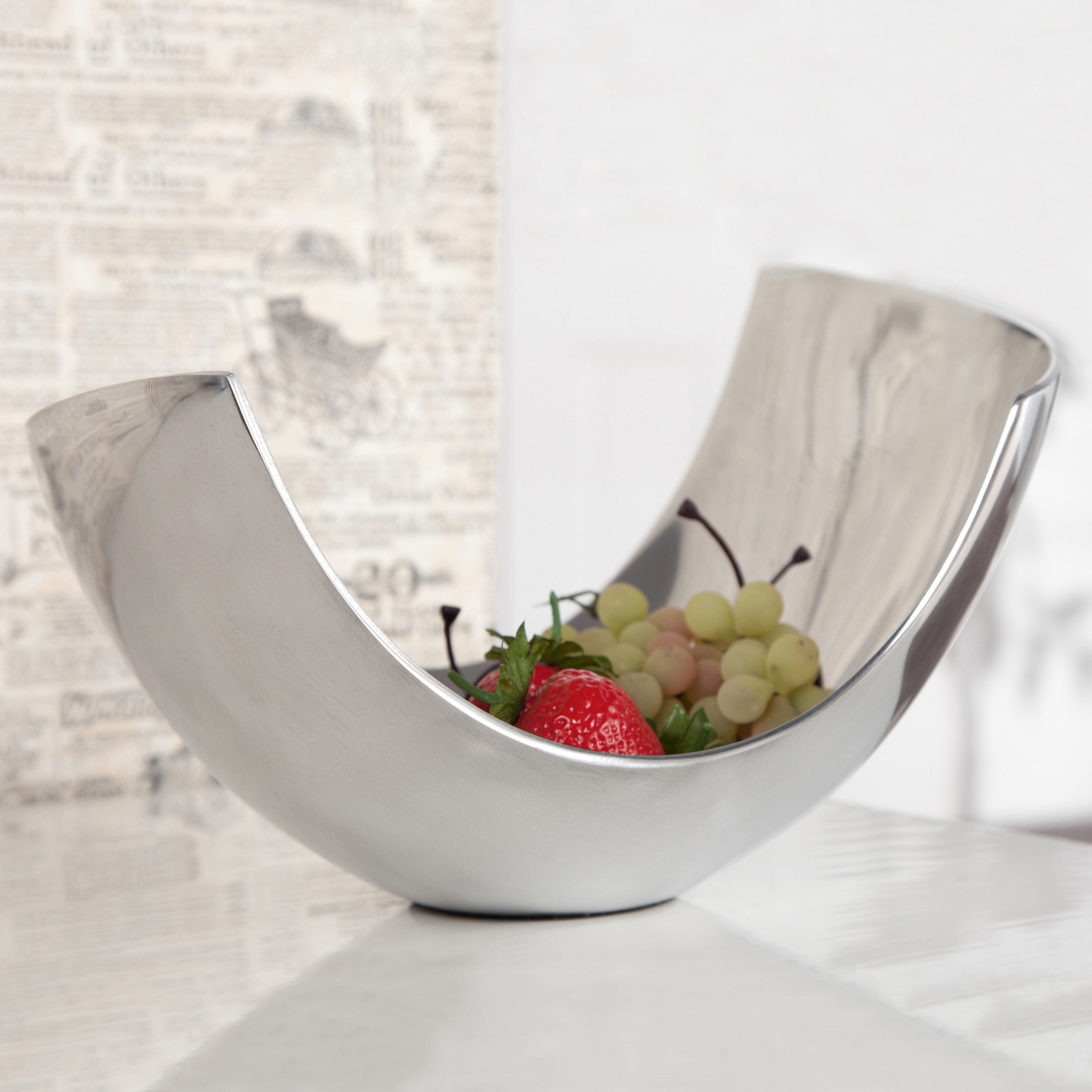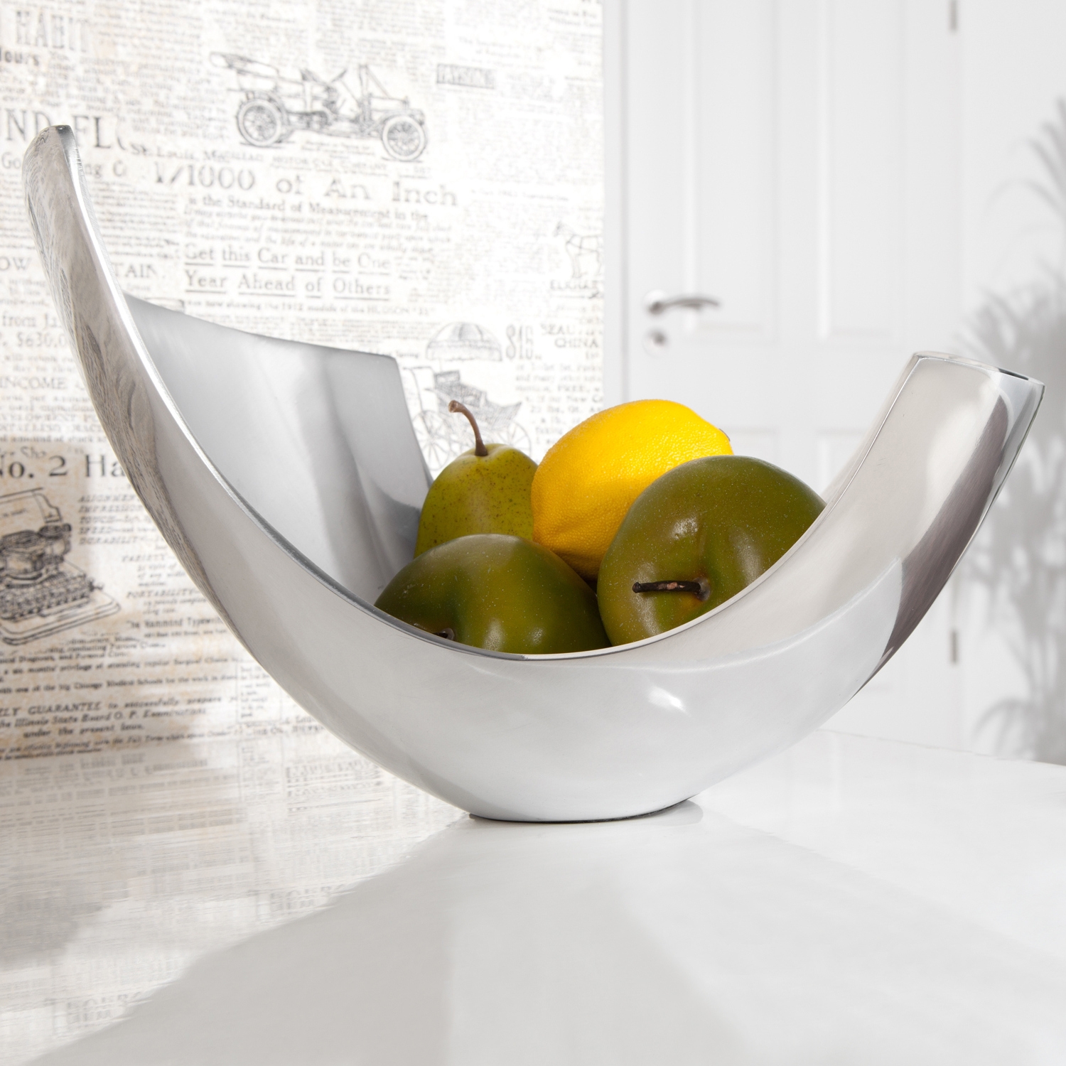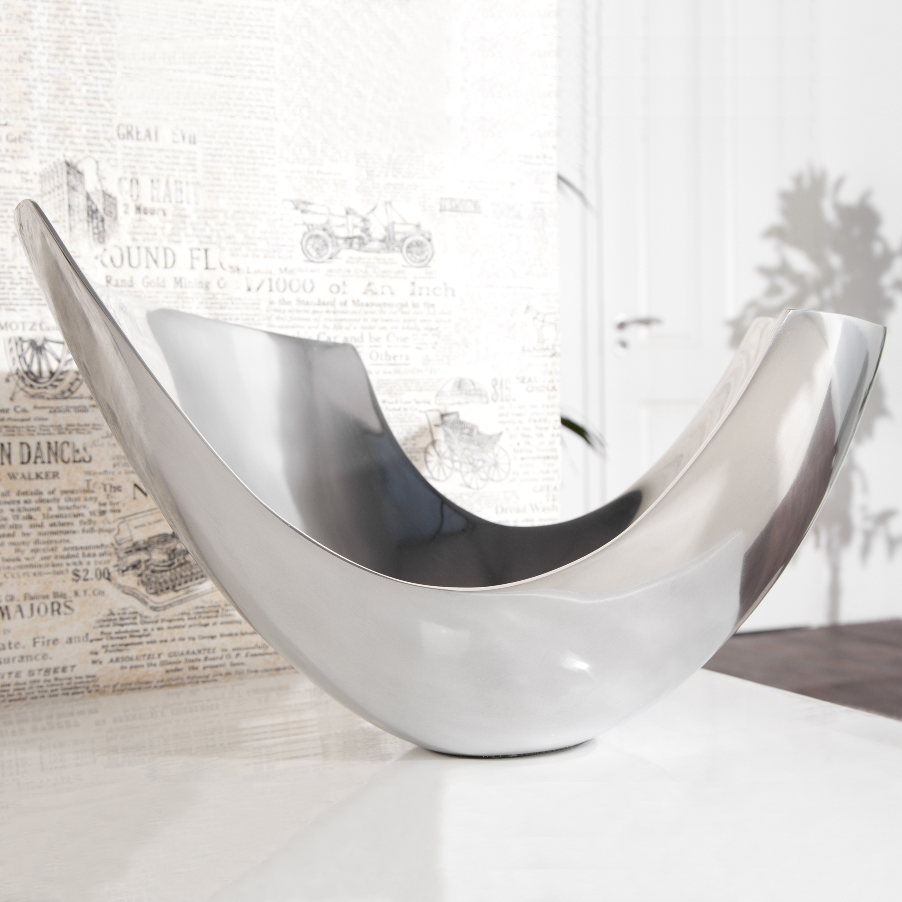 Die außergewöhnliche Designer Obstschale CLEO Silber aus poliertem Aluminium 35cm, gefüllt mit ein paar Früchten, wird sofort zu einem Design-Highlight! CLEO mit seiner stylischen Form und der hochglänzenden Optik wurde in vielen einschlägigen Interior-Fachzeitschriften vorgestellt und ist bei Designfreunden weltweit bekannt und erfreut sich größter Beliebtheit.