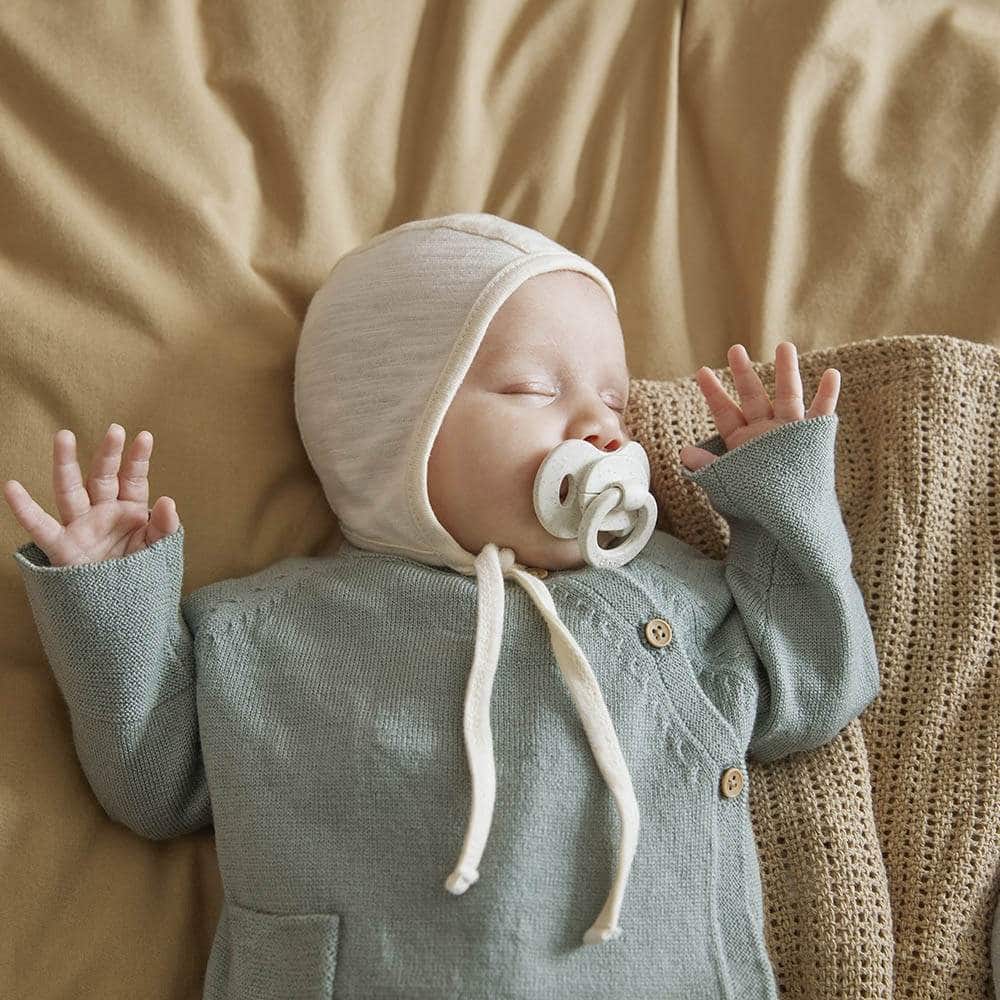 Aus leichter, atmungsaktiver und superweicher Jersey-Baumwolle, die nicht juckt oder ihre Form verliert. Schnüre, die unter dem Kinn befestigt sind, halten sie sicher an Ort und Stelle.