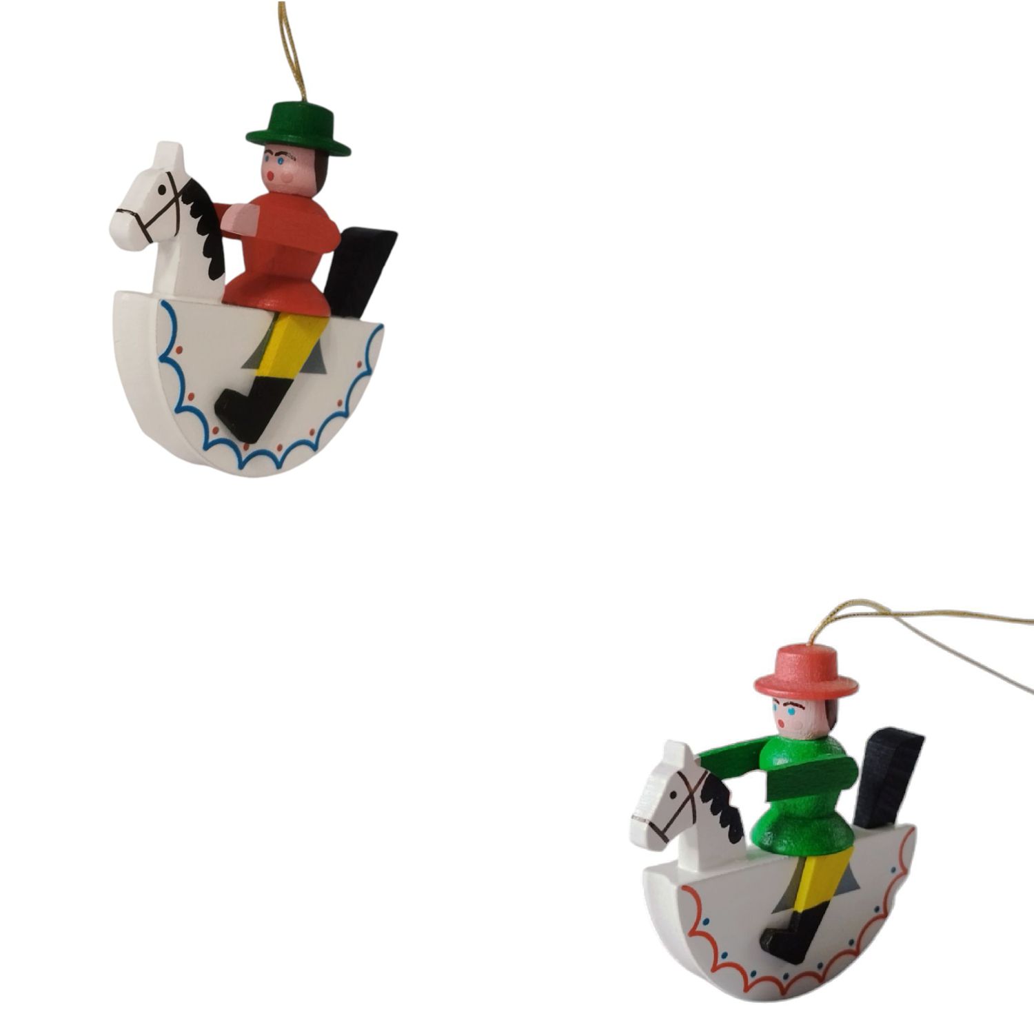 Die Figur ist lebhaft und bunt gestaltet, was ihr einen verspielten und festlichen Charakter verleiht. Das Reiterlein sitzt auf einem kleinen Schaukelpferd, das in einem strahlenden Weiß gehalten ist. Dieses Pferd ist nicht nur schlicht weiß, sondern wird durch liebevoll gestaltete, farbige Akzente lebendig gemacht. Auf der Vorderseite des Pferdes sind schwarze Details aufgemalt, die die Augen und das Zaumzeug darstellen, während der Körper durch blaue und rote Verzierungen an der Schaukelbasis ergänzt wird. Diese Verzierungen verlaufen in wellenförmigen Mustern und verleihen dem Pferd eine fröhliche und dynamische Note.