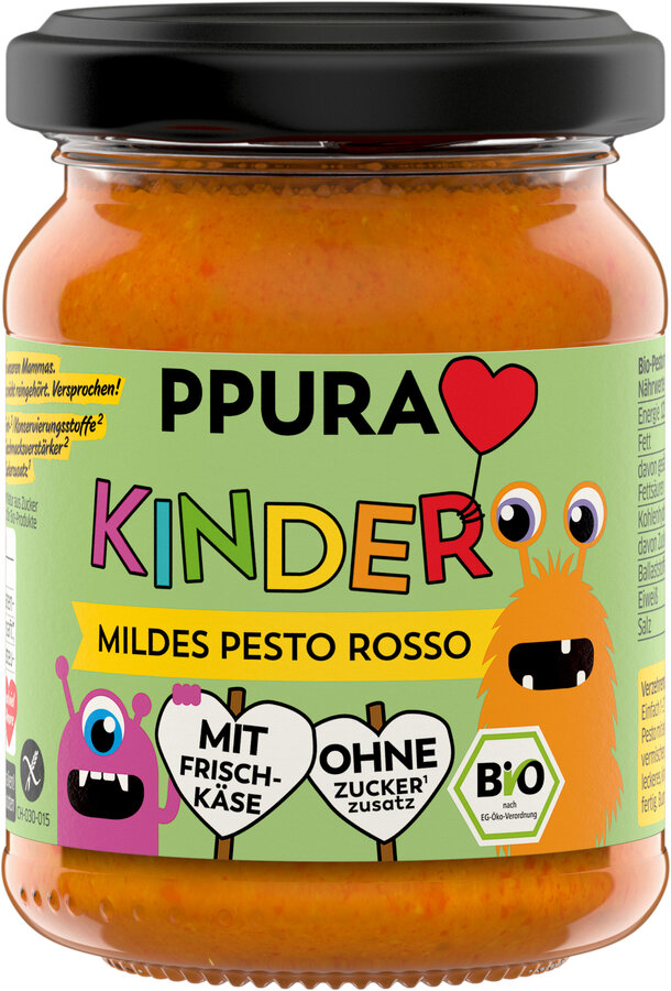 Unsere Mammas hatten schon immer einen Trick, mit dem Pesto für Kinder unwiderstehlich wird: Ein Klecks Frischkäse bringt eine Extraportion Cremigkeit. Und genau so machen wir es auch jetzt: Sonnengereifte Tomaten oder frischer italienischer Basilikum werden mit mildem Frischkäse kombiniert. Mit Zutaten, die wir aus der Küche unserer Mammas kennen und ganz ohne Zuckerzusatz oder Süßungsmittel. Für unsere Kinder – und für alle anderen Kinder auch.
