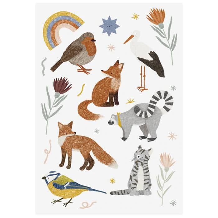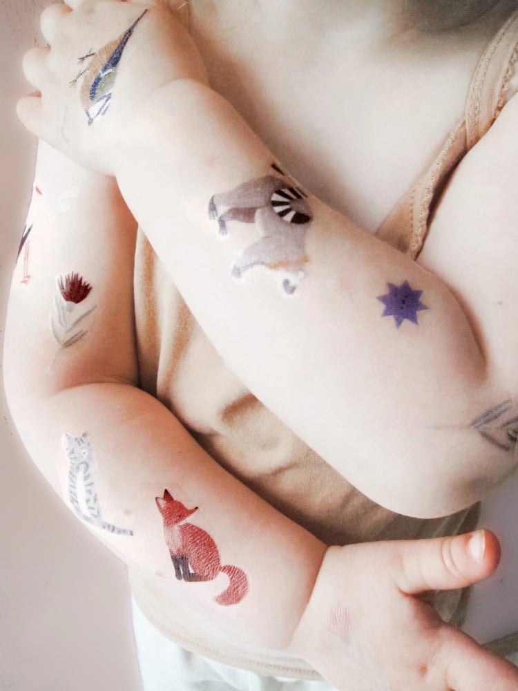 Die süßesten aller Kindertattoos für kleine GärtnerInnen mit Rotkehlchen, Meise, Storch, Fuchs und Blumen.