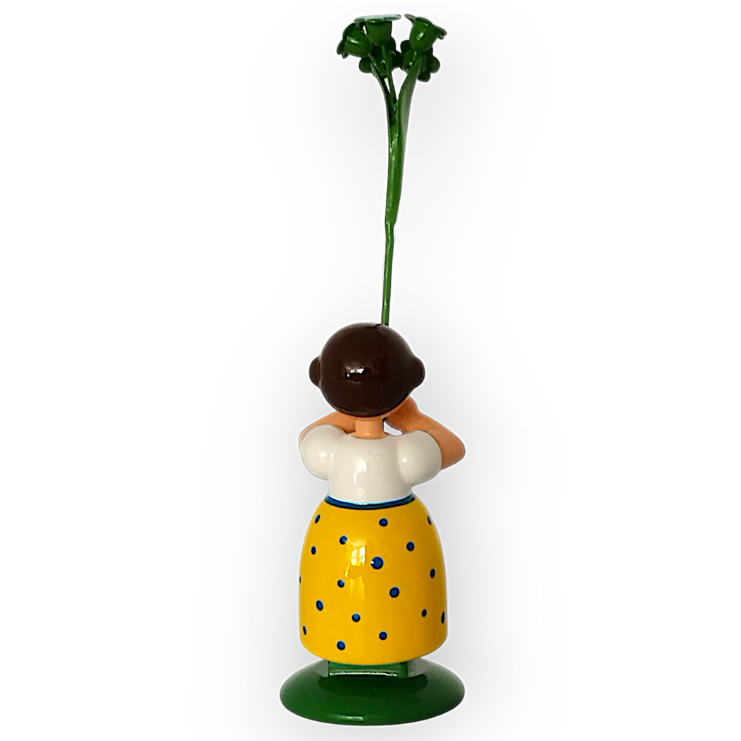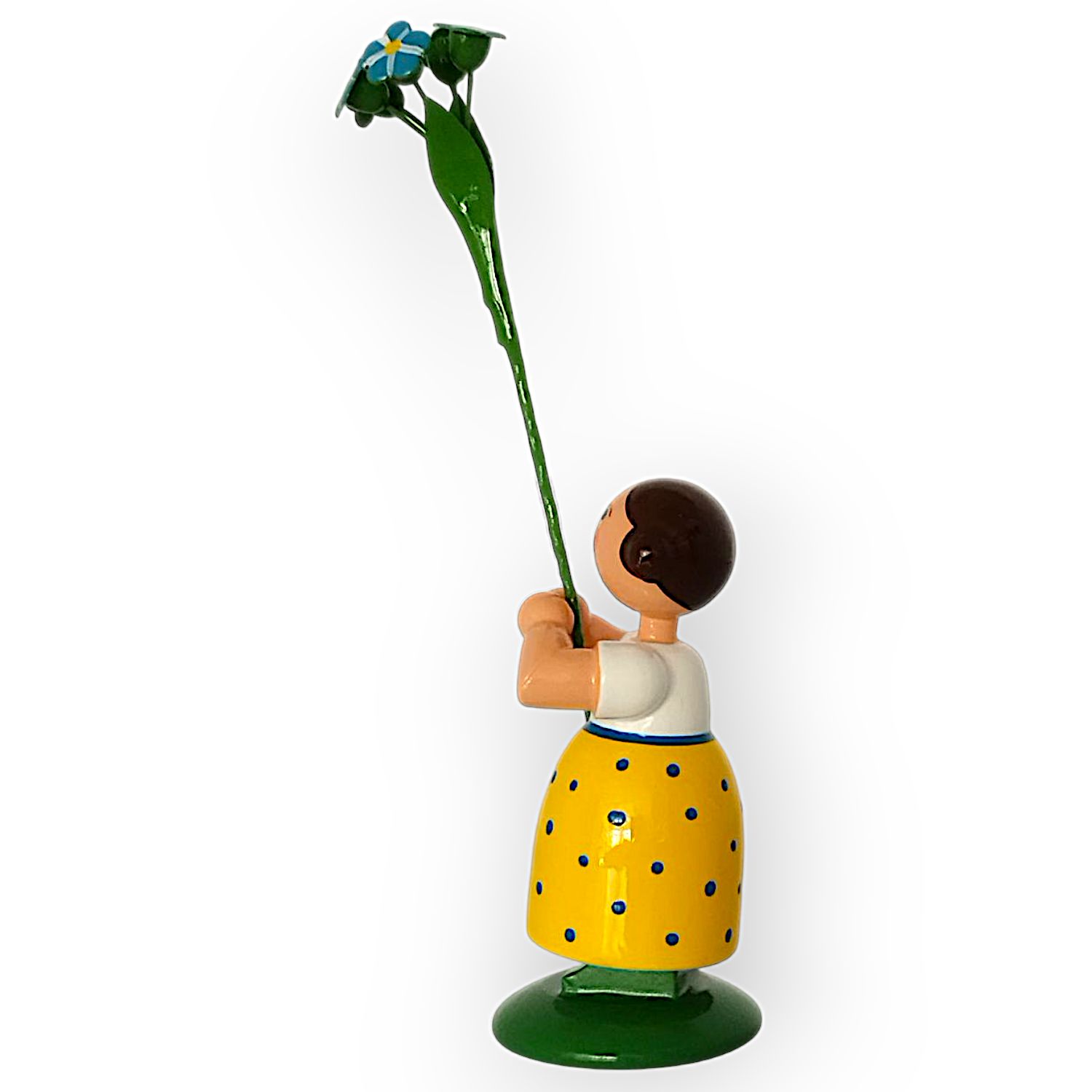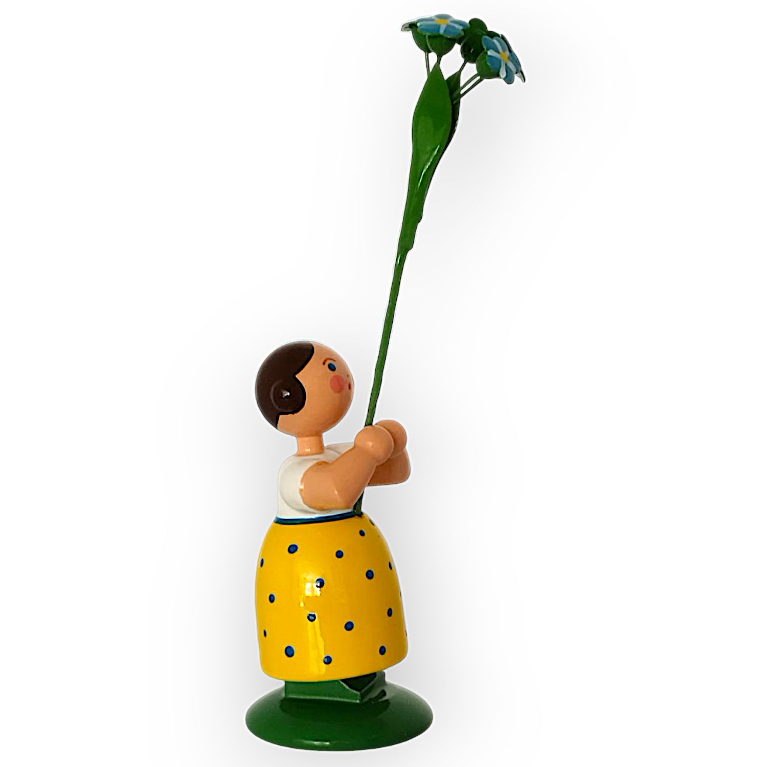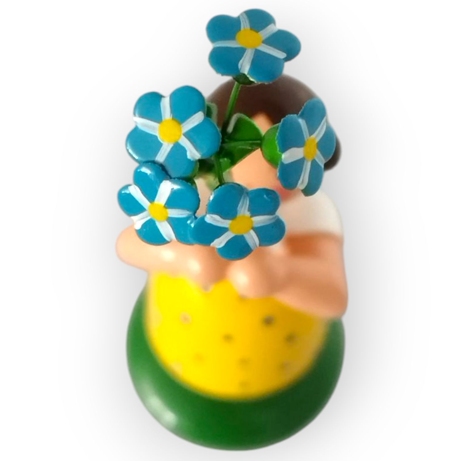 Im frühlingshaften gelben Kleid mit der weißen Bluse zaubert dieses Blumenmädchen Sonnenschein in jedes Zuhause, in der Hand hält es eine große, leuchtend blau-weisse Vergissmeinnicht.. Das freundliche Gesicht des kleinen Mädchen mit den rosa Wangen, den blauen Augen sowie dem roten Mund wird detailreich von Hand aufgemalt, die braunen Haare des Blumenkindes sind seitlich zu 2 Haarschnecken eingedreht.