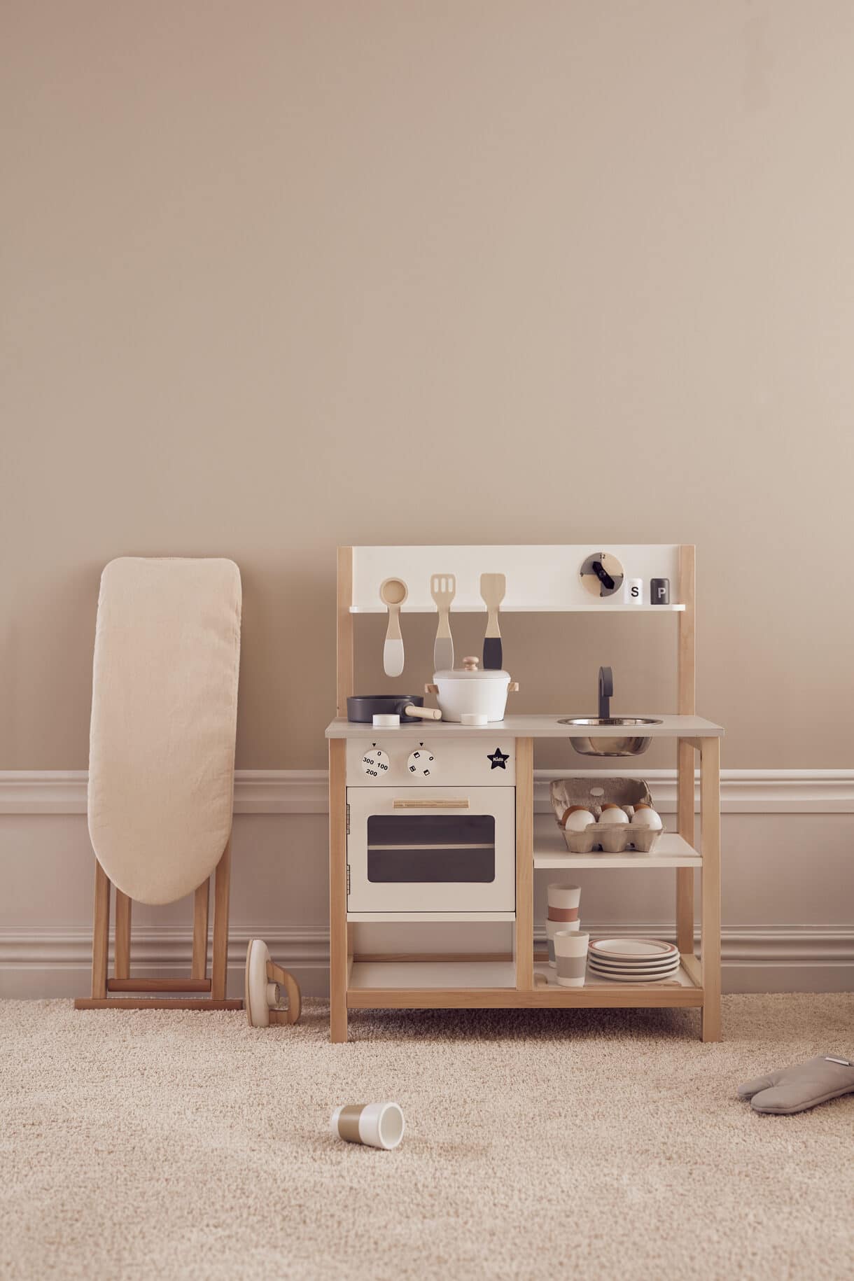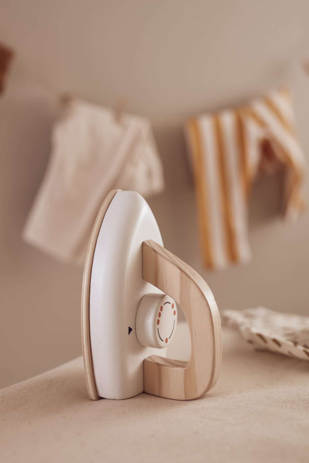 Das Bügelbrett hat einen abnehmbaren Baumwollbezug. Der Knopf am Bügeleisen hat ein Klickgeräusch und kann gedreht werden. Das Brett ist faltbar und kann bei Nichtgebrauch einfach weggeräumt werden. Kinder machen gerne das, was wir Erwachsenen auch tun. Bügeln und Rollenspiele sind ein Teil des Lernens und sorgen für viele Stunden Spielspaß.