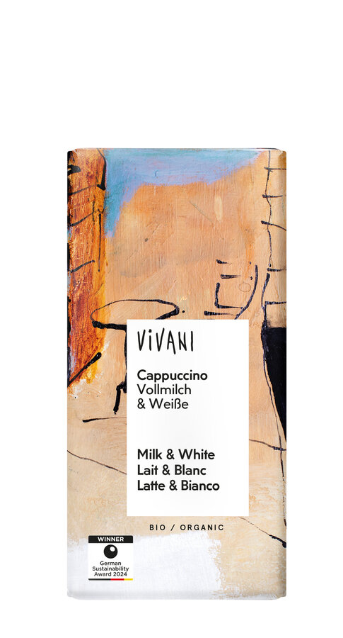 Zartschmelzende Schokolade in einer Zwei-Schichten-Komposition: cremige weiße Schokolade und Vollmilch Schokolade, verfeinert mit bestem Espresso.