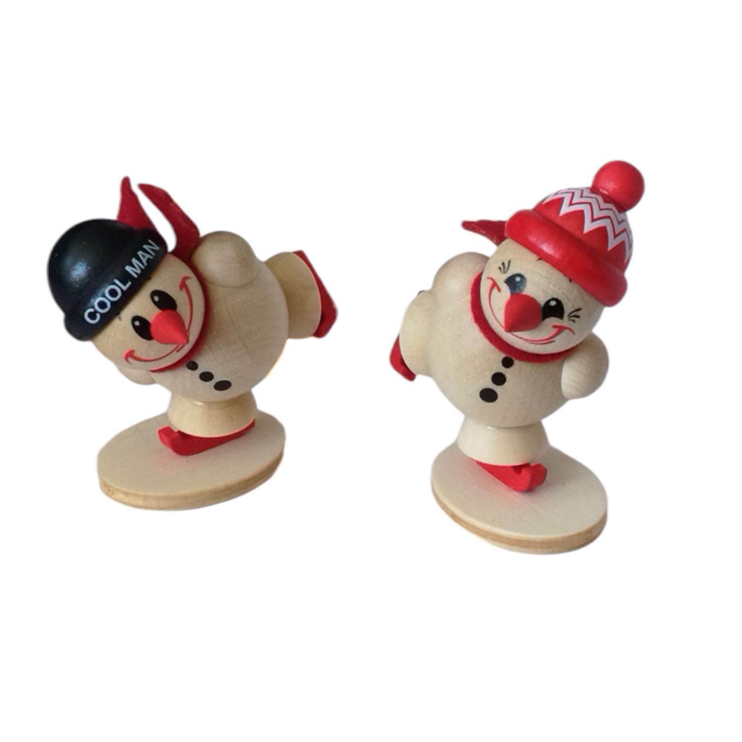 Die linke Figur trägt eine schwarze Mütze mit der Aufschrift “COOL MAN”. Diese Mütze betont ihren coolen Charakter und verleiht ihr einen modernen Look. Die rechte Figur trägt eine rote Bommelmütze, verziert mit einem weißen Zickzackmuster. Diese Mütze lässt sie besonders winterlich erscheinen. Beide Schneemänner stehen auf einer ovalen Basis, die ihre stabilen Posen unterstützt. Es sieht aus, als ob sie sich mitten in einer eleganten Schlittschuhpirouette befinden.
