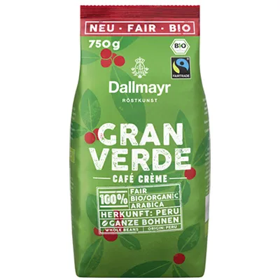 Dieser erlesene Kaffee aus dem Hochland von Peru enthält feinste Arabica-Bohnen aus Bio- und Fairtrade-zertifiziertem Anbau. Durch die fairen Preise werden nicht nur die Einkommen der Bauern, sondern auch soziale und ökonomische Lebensbedingungen vor Ort verbessert. Ein Gewinn für alle in der Region. Mit Dallmayr Gran Verde genießen Sie einen herausragenden Bio-Kaffee mit feiner, dichter Crema. Harmonisch und vollmundig mit angenehmer Säure. Ein sortenreiner Ursprungskaffee aus Peru mit feinem Aroma, zertifiziert mit dem Bio- und Fairtrade-Siegel. Den Bio, Granverde, ganze Bohne, aus dem Hause Dallmayr erhalten Sie in einer 750 g Packung.