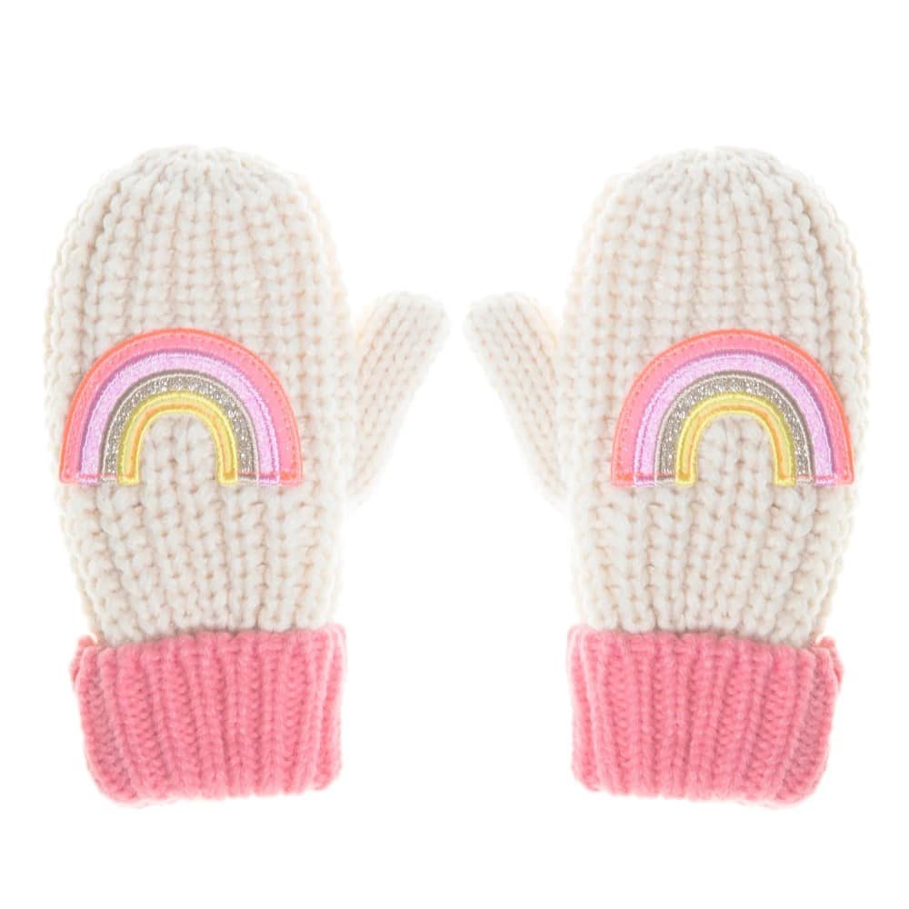Dieses Set aus lustigen gestrickten Fäustlingen ist mit Fleece gefüttert und mit wunderschönen Korallenbündchen und Regenbogenapplikationen versehen.