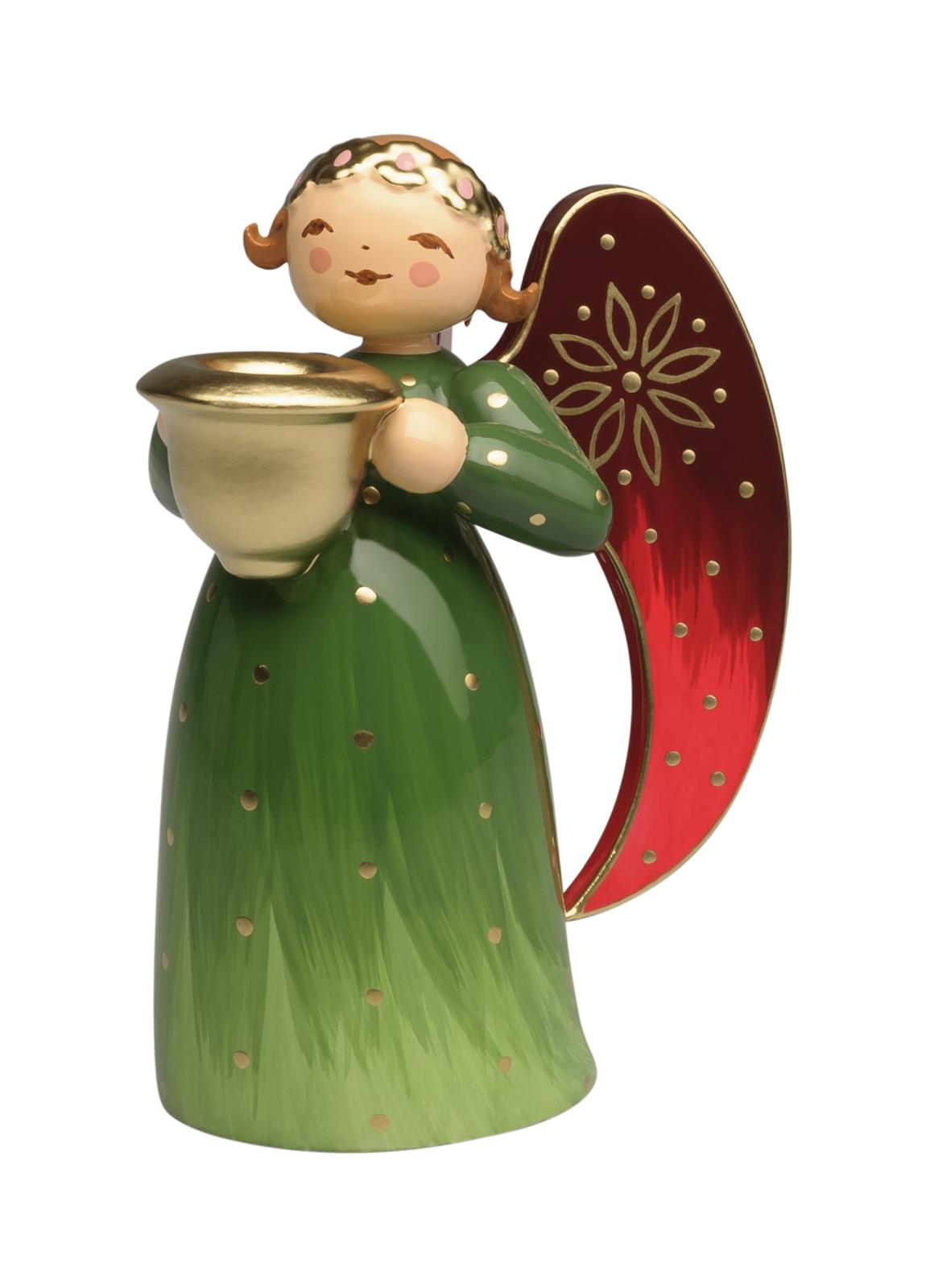 Die reich bemalten Engel in ihren blauen und roten Roben sind längst unverzichtbarer Teil des Sortiments geworden. Mit ihren bodenlangen, wallenden Kleidern und den goldfarbenen Blumenkränzen auf den Köpfen strahlen sie Anmut und Eleganz aus. 2012 ergänzten ein großer orangener und ein großer grüner Engel die Figurengruppe. Der grüne stand nun Modell für die Bemalung seiner kleinen Geschwister, die ab Mai neue Dekorationsmöglichkeiten eröffnen. In unterschiedlicher Größe und jeweils den Kopf leicht zur linken oder rechten Seite geneigt (außer der Geigenspieler), stehen sie in Meisterschaft und Raffinesse ihrem großen Vorbild in nichts nach. Nur wenige andere Figuren vereinen die Perfektion von Formgebung und Farbgestaltung so eindrucksvoll wie die reich bemalten Engel. PRODUKTSICHERHEITSUND