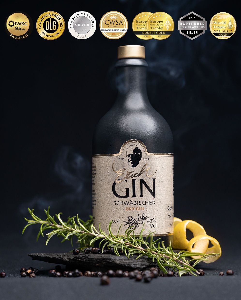 Probieren Sie unseren 4-fach goldprämierten Erich “Schwäbischer Dry GIN” mit komplett überarbeiteten Konzept & Geschmack. Unser Schwäbischer Dry GIN zeichnet sich durch seinen zitrusfrisches vollmundigen Charakter aus.