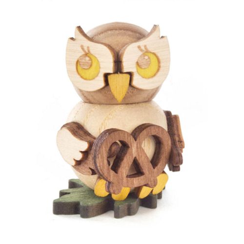 Dieses Eulenkind mit Brezel stammt aus dem traditionsreichen Hause Kuhnert und ist ein echter Blickfang. Diese Eule ist aus nachhaltigen Hölzern gefertigt und besticht durch ihre charmante sowie detailreiche Handarbeit. Die Eule zeichnet sich durch ihr helles Holzdesign aus, welches die natürliche Maserung des Holzes deutlich zur Geltung bringt.