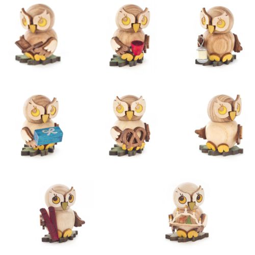 Die aus nachhaltigen Hölzern gefertigten Eulen gibt es aus allen Lebenslagen, sie zaubern jedem Betrachter ein Lächeln ins Gesicht.