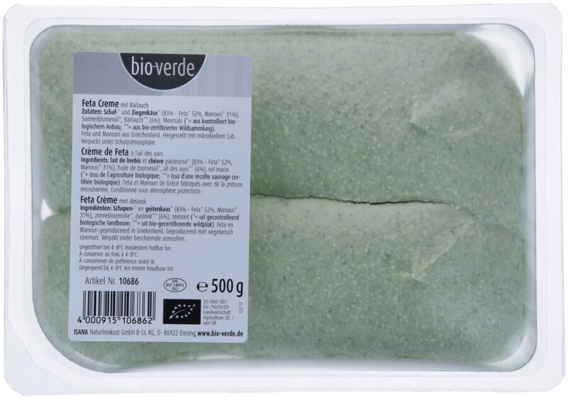 Die Feta-Creme mit Bärlauch ist eine streichfähige Paste aus griechischem Schafs- und Ziegenkäse, Sonnenblumenöl und Bärlauch.