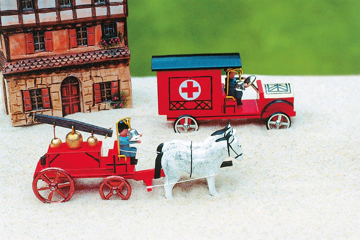 Diese Sammelfigur Feuerwehr – Krankenwagen wird in liebevoller sowie aufwendiger Handarbeit von der Firma Rainer Flath hergestellt und detailreich von Hand bemalt.