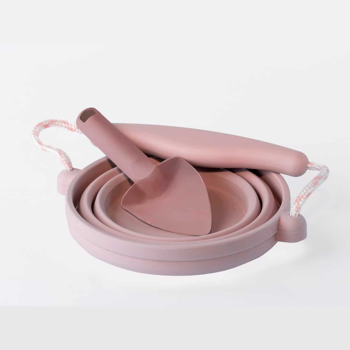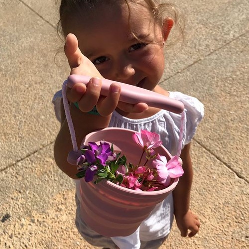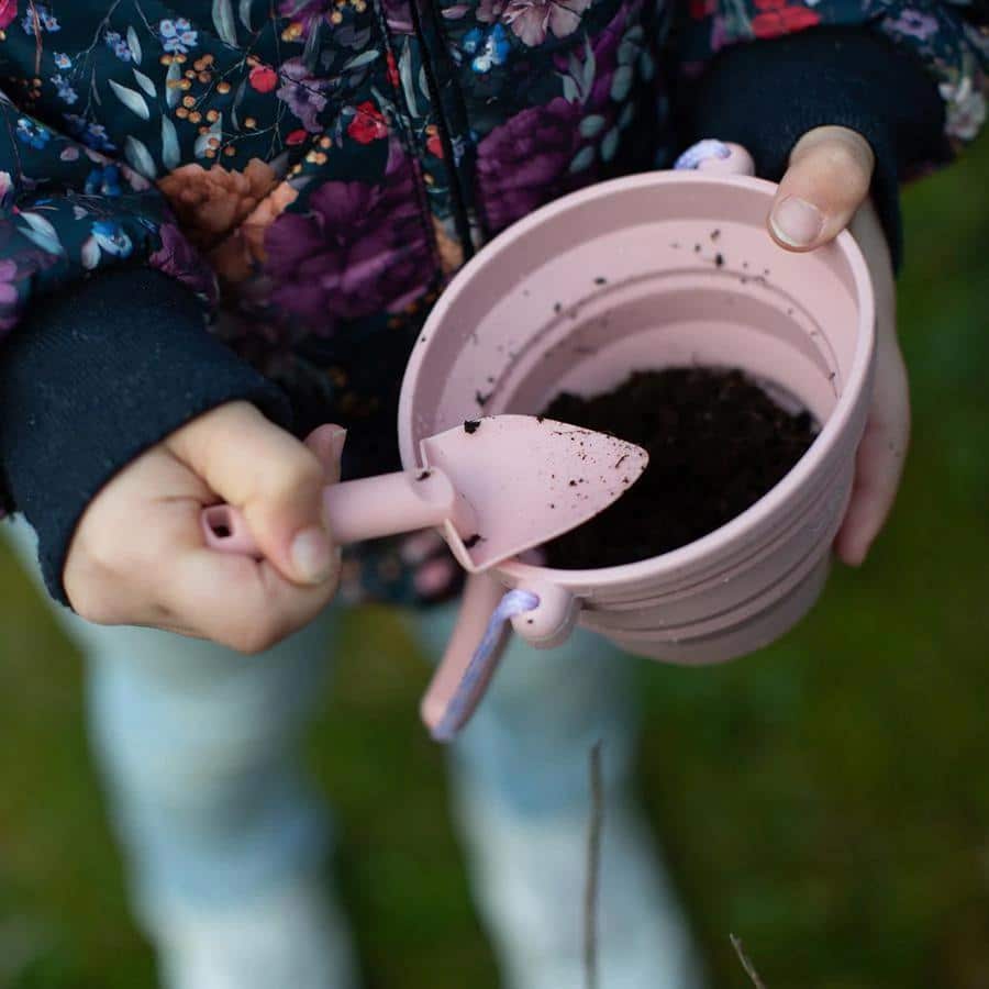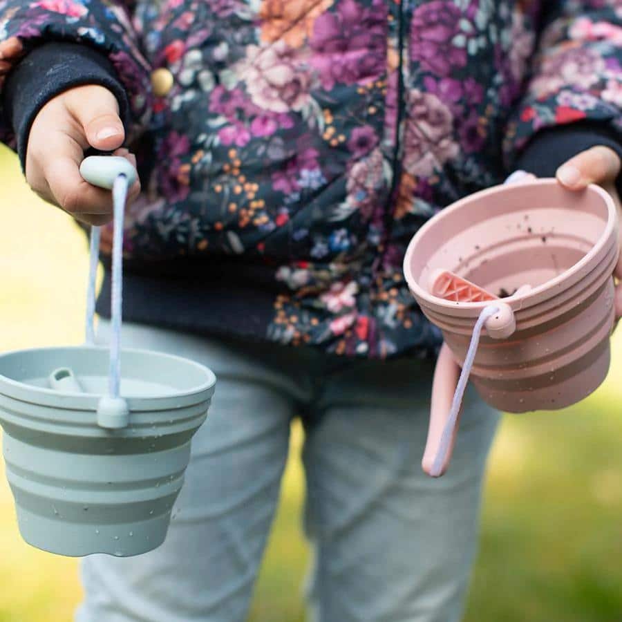 Das Set besteht aus einem faltbaren Eimer sowie einem kleinen passenden Spaten. Der Eimer lässt sich in sich zusammenfalten und bietet Platz für Blumen, eine Tomatenpflanze oder Samen, die man beim Wachsen beobachten kann.