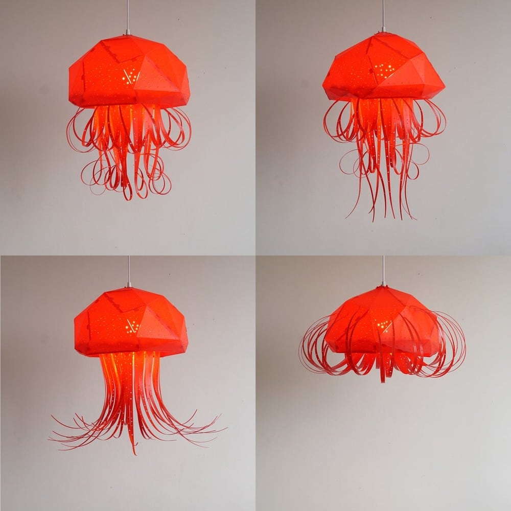 Die Leuchte wird ohne Kleber oder andere Klebstoffe aus Lampenschirmfolie handgefertigt.