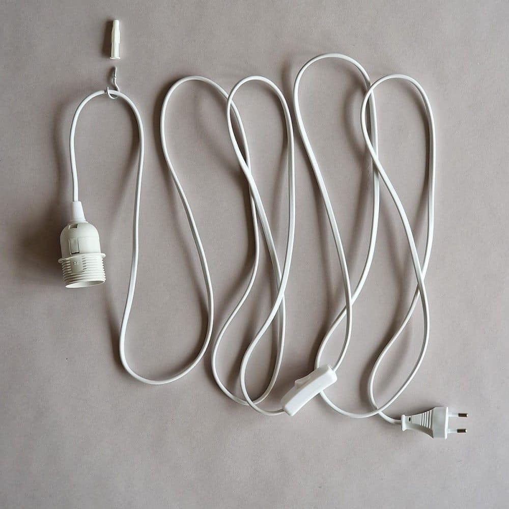 Optional ein Kabelset, bestehend aus Lampenfassung E27, 3,4 m langem Kabel mit Schalter und EU-Stecker. EU-US/UK-Steckeradapter ist verfügbar.