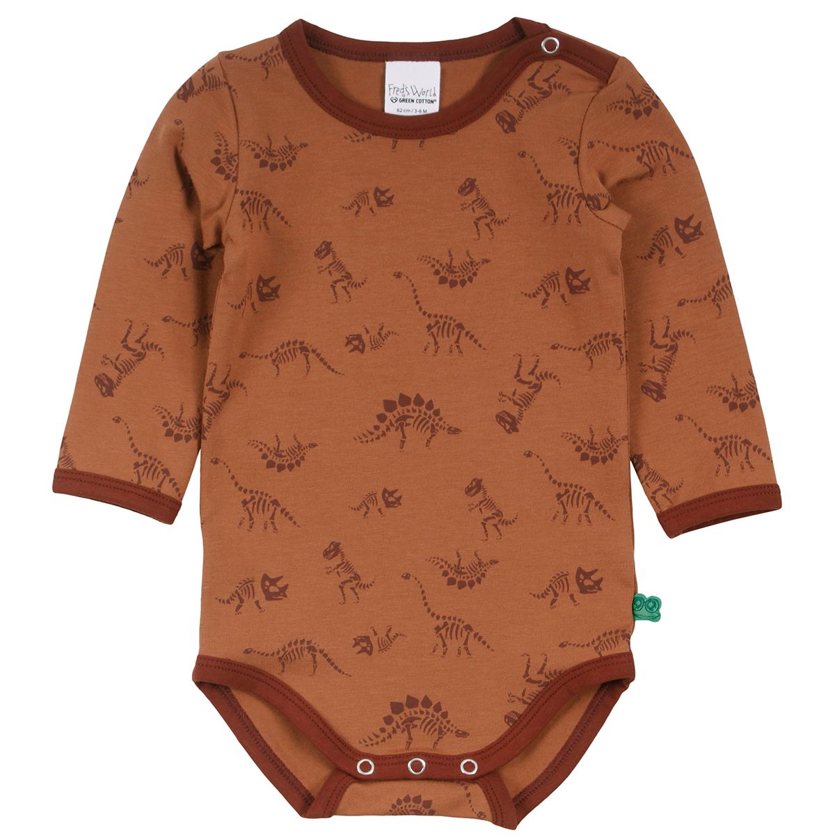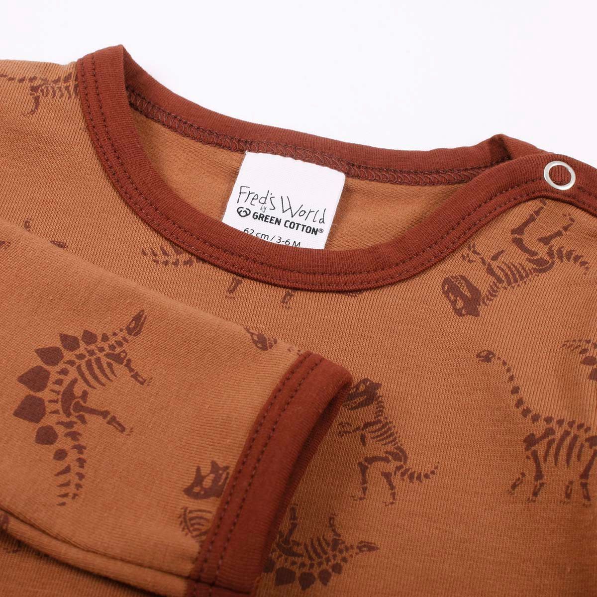 Langarmbody in chocolate-brown mit Dinosauriern bedruckt.