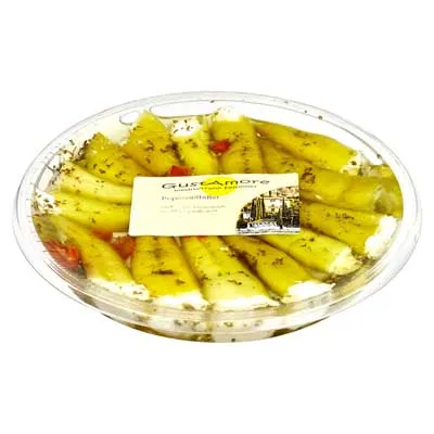 Der Peperoniteller von Gustamore ist eine köstliche Delikatesse. Milde Peperonis, gefüllt mit cremigem Frischkäse sind ein wahrer Genuss für Feinschmecker. In Öl eingelegt erhalten sie einen unverwechselbaren Geschmack. Den Peperoniteller der Marke Gustamore erhalten Sie in einer 300 g Packung.
