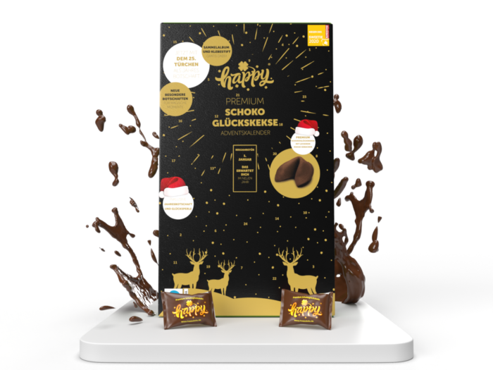 ür alle, die lieben Menschen die Weihnachtszeit versüßen wollen: Unser Adventskalender mit Happy Schokokeksen macht einfach glücklich. Der Kalender kommt mit 24 einzeln verpackten Premium-Schokoglückskeksen, einem 25. Türchen, einfühlsamen Botschaften und weiteren tollen Überraschungen. Erlebe eine traumhafte Vorweihnachtszeit. Be happy!