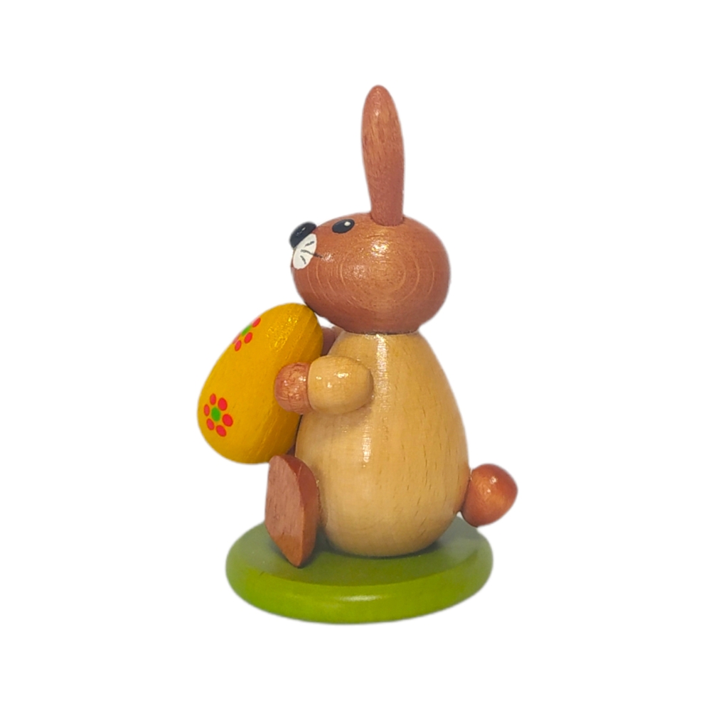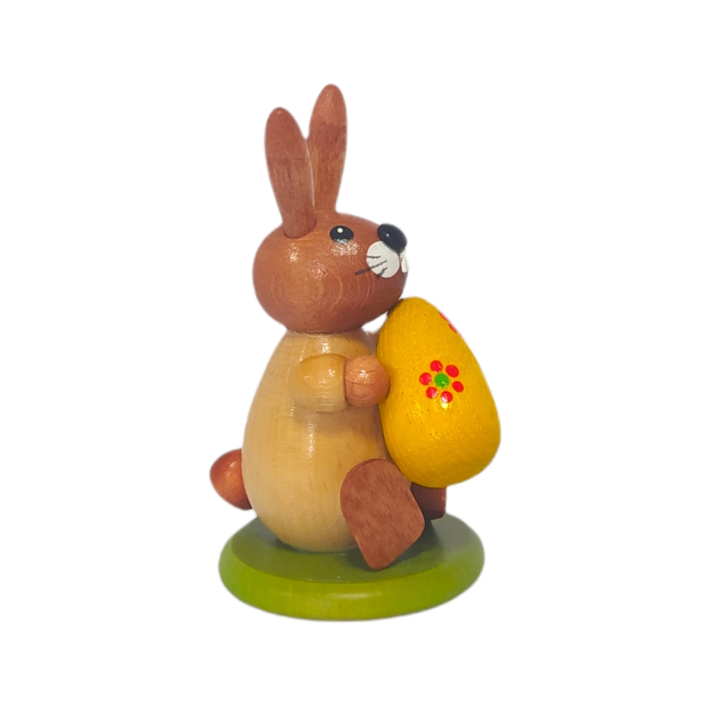 Zum Ende des erzgebirgischen Winters beginnt mit dem Osterfest das Frühjahr, neues Leben erwacht in der Natur und die entstehende Farbenpracht weckt neue Lebensgeister. Ganz in Brauntönen gehalten hält der Hase ein großes gelb bemaltes Osterei in Händen, welche er liebevoll mit Blumen verziert hat.