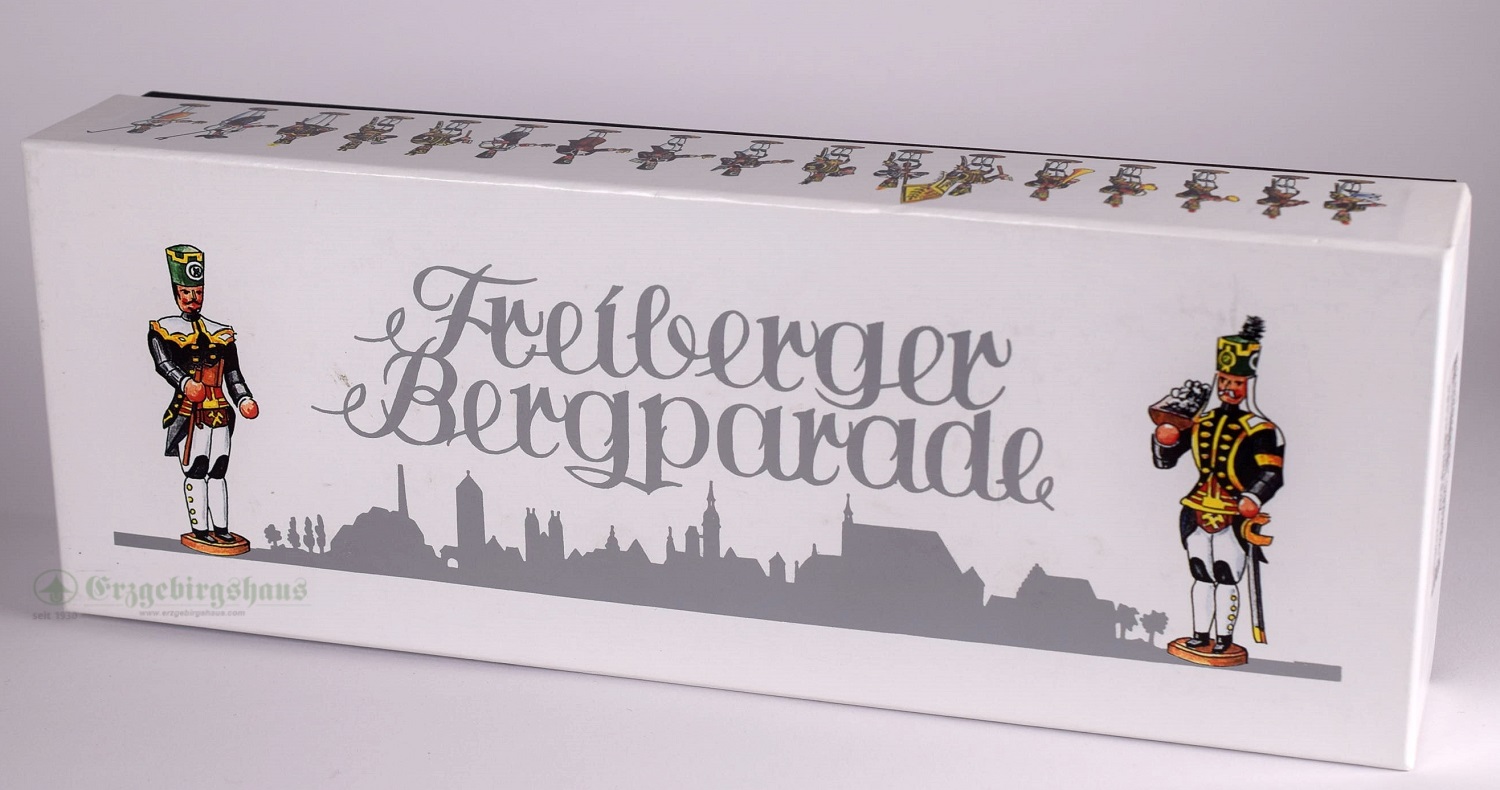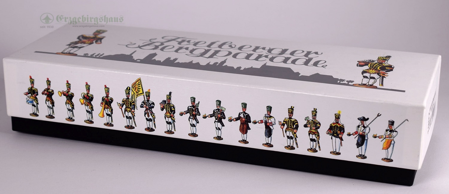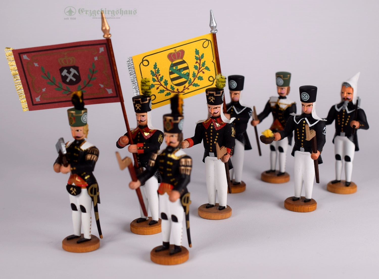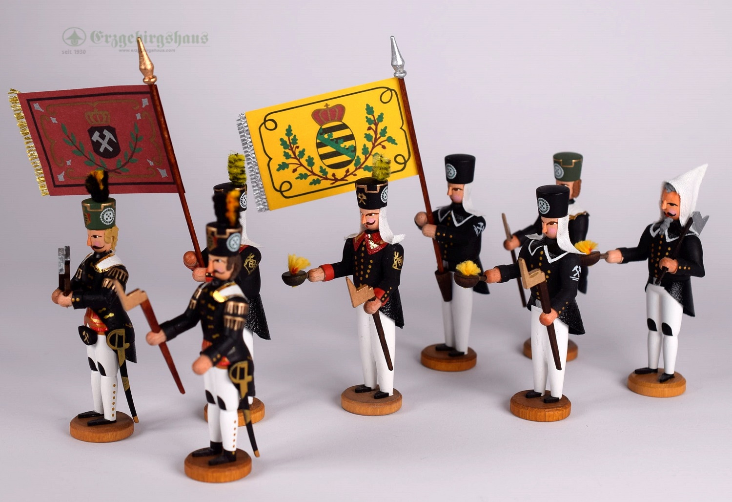 - 8-teiliges Set mit Vertretern der Montanwissenschaften (Professor der Bergakademie, Marktscheider, Träger der Akademiefahne (rot/gold), Träger der Bergschülerfahne (gelb/schwarz), Bergakademist, Bergschüler, Steiger und Altvater))