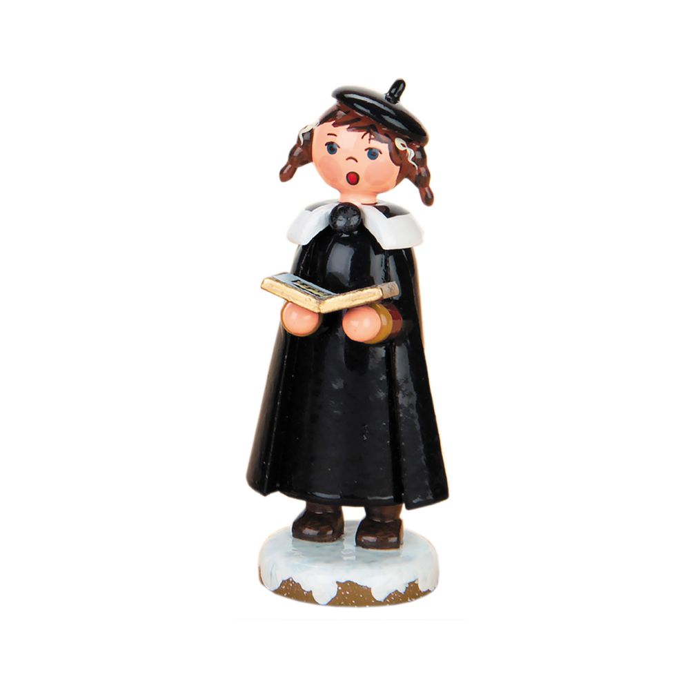 Dieses in kräftigen Farben bemalte Kurrendenmädchen mit Buch und Zöpfen stammt aus dem Hause Hubrig.