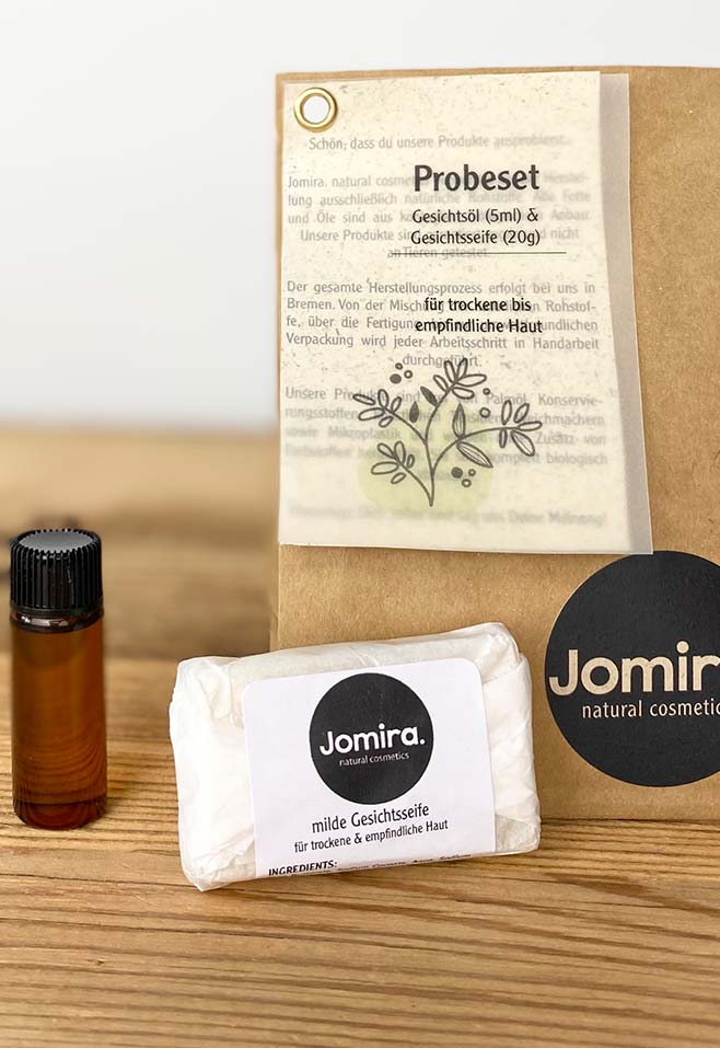 Teste unsere Produkte! Unser kleines Probeset mit den beliebtesten Jomira-Produkten für trockene bis empfindliche Haut. Das Probeset beinhaltet ein kleines Stück (20g) sanfte Gesichtsseife für trockene bis empfindliche Haut mit weißer Tonerde und nährendem Sesamöl sowie ein kleines Fläschen Gesichtsöl (5ml) aus Mandel & Jojobaöl. Natürlich gibt es das Set wahlweise auch als parfümfreie Variante.
