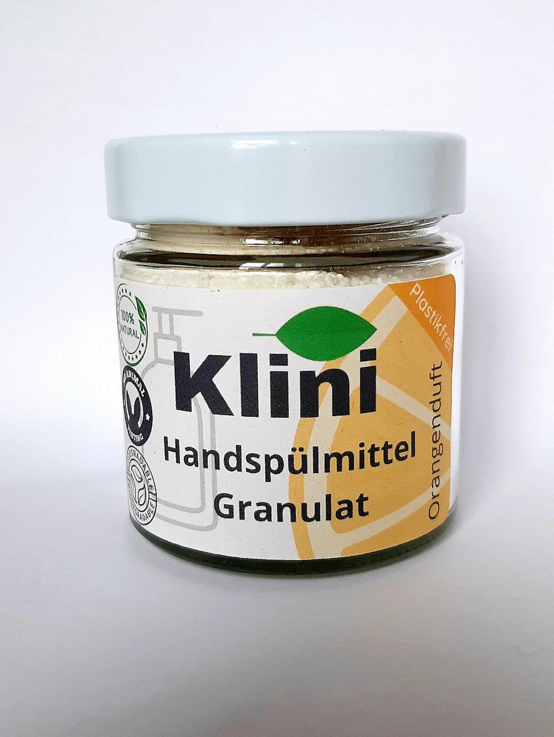 Mit dem Klini Handspülmittel Granulat kann man sein eigenes Spülmittel durch Zugabe von Wasser herstellen. Der natürliche Duft des fertigen Spülmittels erinnert an frisch aufgeschnittene Orangen.