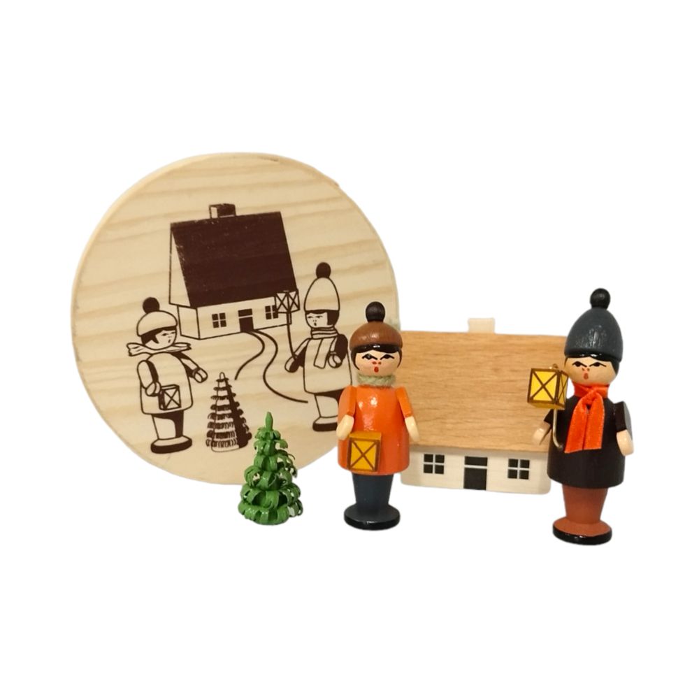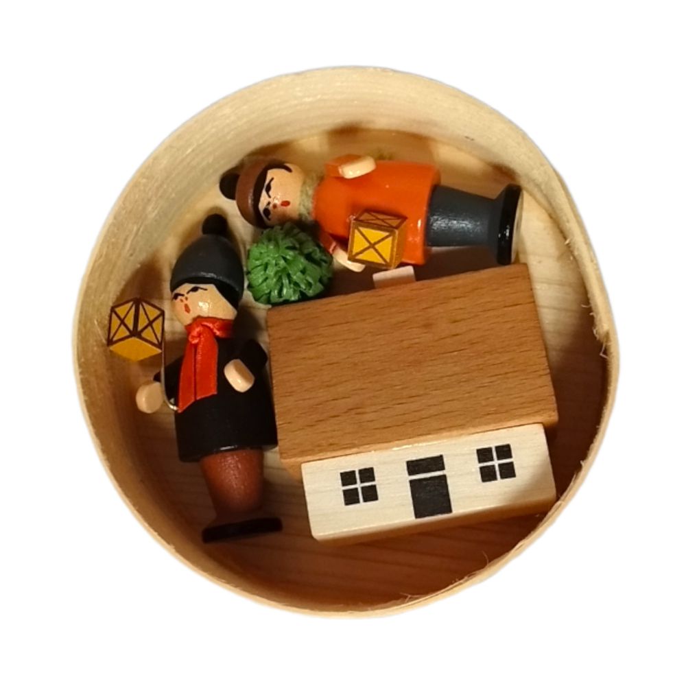 In einer handbedruckten Spanschachtel finden 2 bunt bemalte Laternenkinder, ein Häuschen sowie ein Spanbaum Platz.