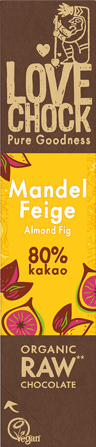 Lovechock ist 100% biologisch, vegan und wird mit bestem Rohkakao aus Direkthandel hergestellt. Die Verpackung ist heimkompostierbar – Vegan Goodness für Menschen und Erde. Mandel & Feige ist eine leckere Schokolade mit 80% Kakaoanteil und nur mit Kokosblütennektar gesüsst.