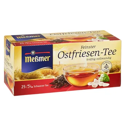 Wenn es um Tee-Spezialitäten geht, lassen sich Ostfriesen nichts vormachen. Kräftig und vollmundig muss er sein – so wie der feinste Ostfriesen-Tee aus dem Hause Meßmer. Schwarzer Tee, Ostfriesen-Tee, kräftig-vollmundig, der Marke Meßmer erhalten Sie in einer 37,5 g Packung mit 25 Teebeutel à 1,5 g.