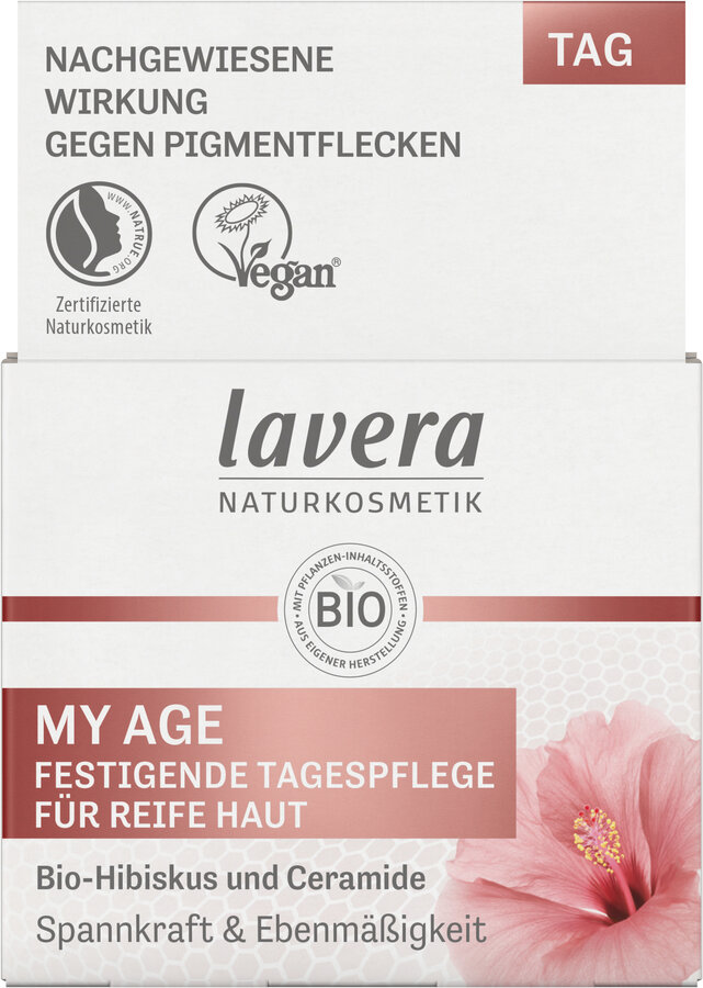 Erlebe das lavera Gefühl natürlich wertvoller Gesichtspflege für reife Haut: Unsere MY AGE Festigende Tagespflege mit Bio-Hibiskus und Ceramiden pflanzlichen Ursprungs mindert Falten und sorgt für ein gefestigtes und ebenmäßiges Hautbild. Spüre wie die reichhaltige Formel schnell einzieht und ein geschmeidig weiches Hautgefühl verleiht.