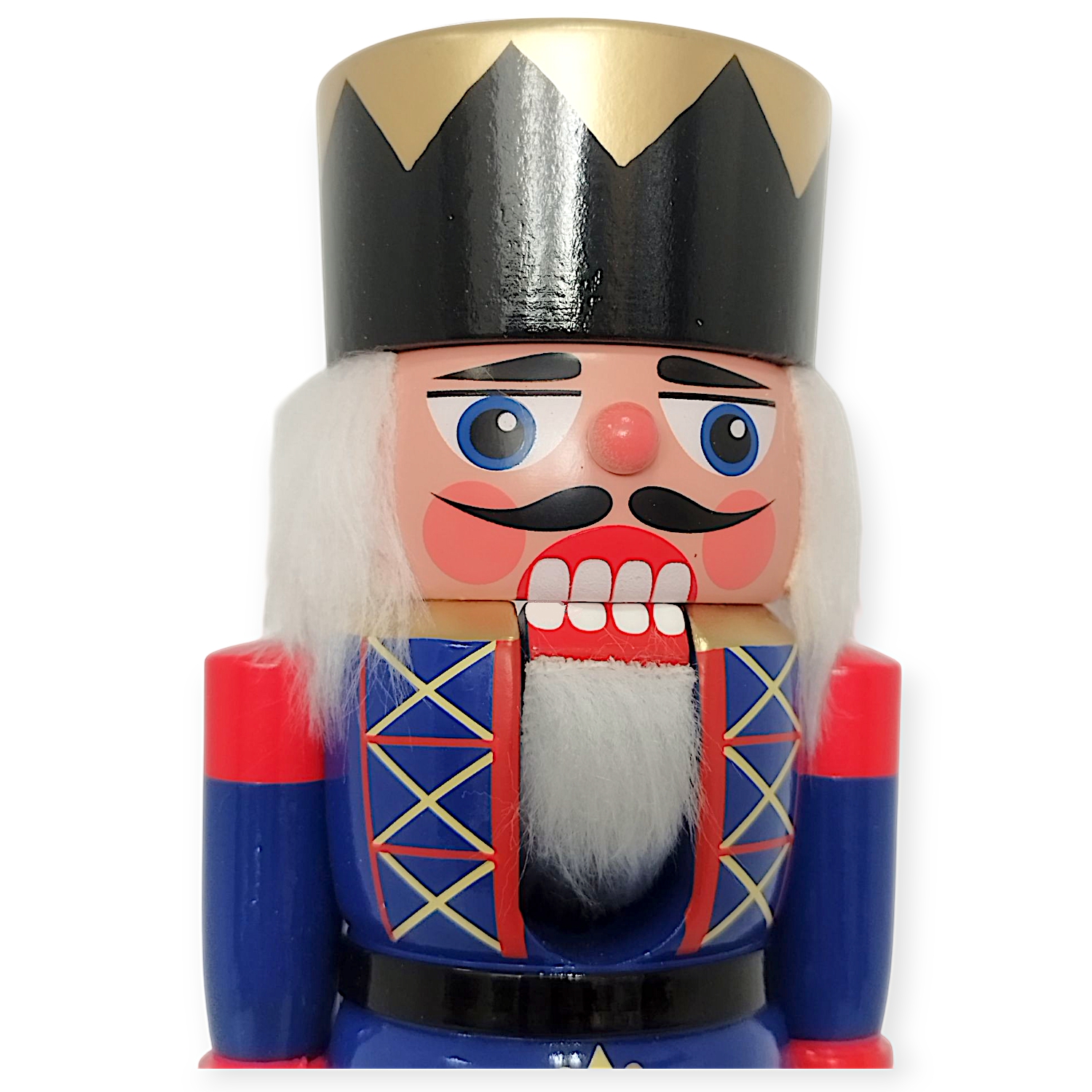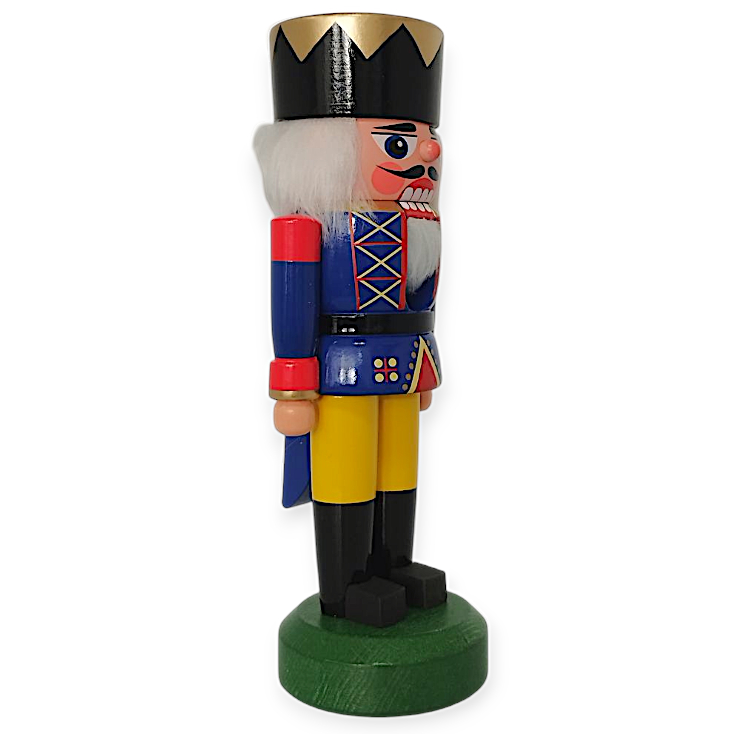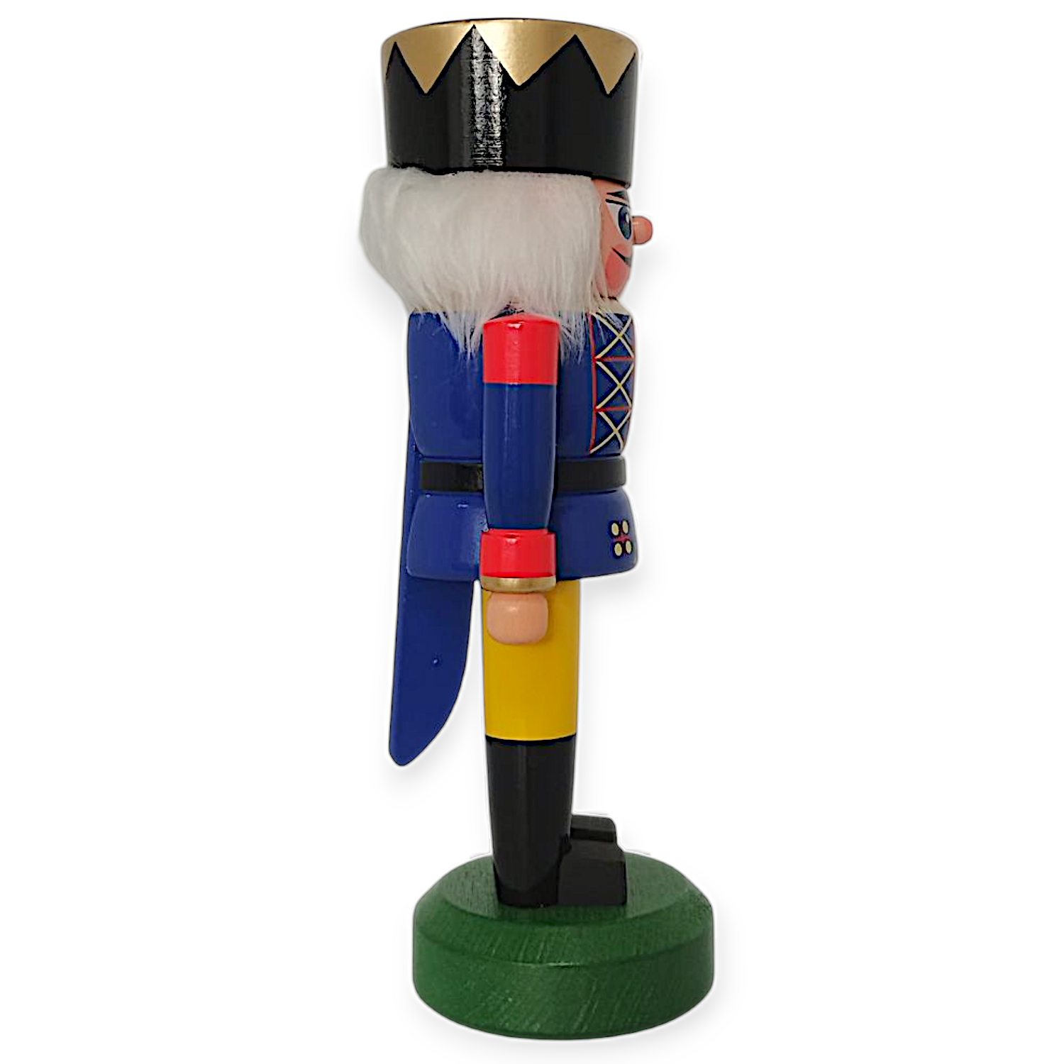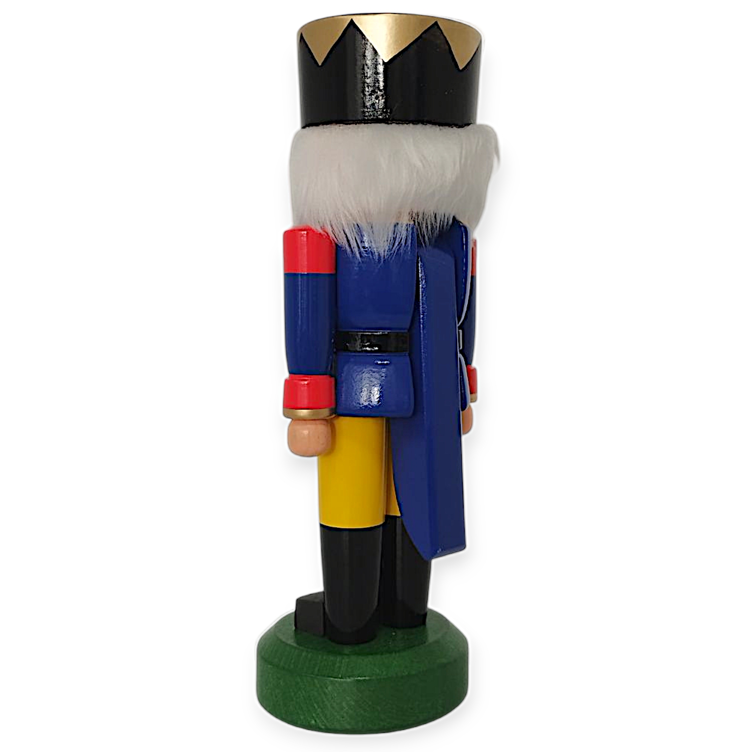 Der kleine Nussknacker-König steht würdevoll und aufrecht auf einem satten, grün bemalten Rundsockel. Mit seiner prächtigen Erscheinung zieht er sofort die Blicke auf sich. Die kräftigen Farben seiner Bemalung – leuchtendes Blau, strahlendes Gelb, tiefes Schwarz und glänzendes Gold – unterstreichen seinen königlichen Rang. Sein blauer Rock reicht bis zur Hüfte und trägt ein kunstvoll aufgemaltes, goldenes Ziermuster mit einem blauen Dreieck auf der unteren Front, das an ein königliches Wappen erinnert. Roten Ärmelmanschetten und eine gleichfarbige Hose bilden einen auffälligen Kontrast zur dunklen Stiefelpartie.