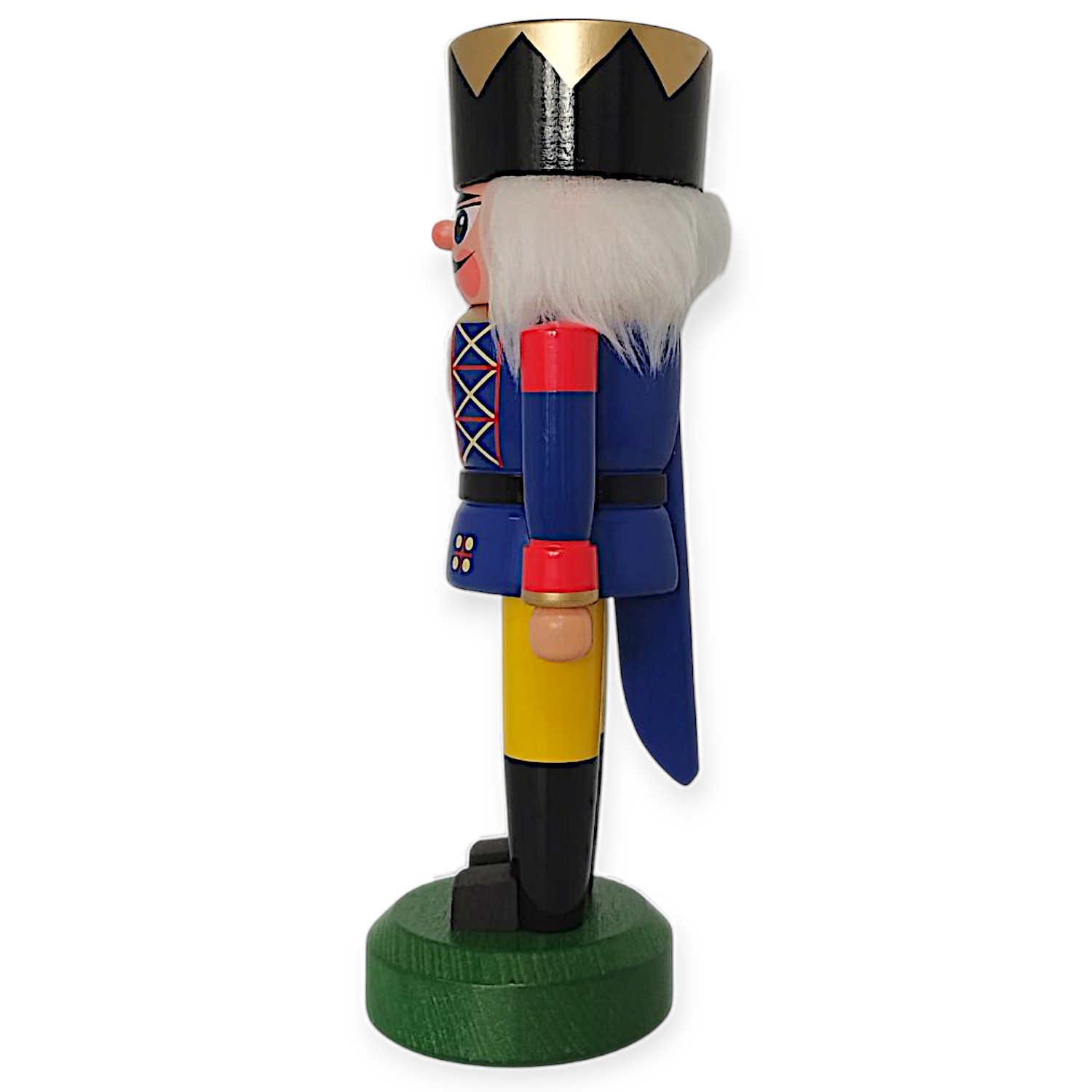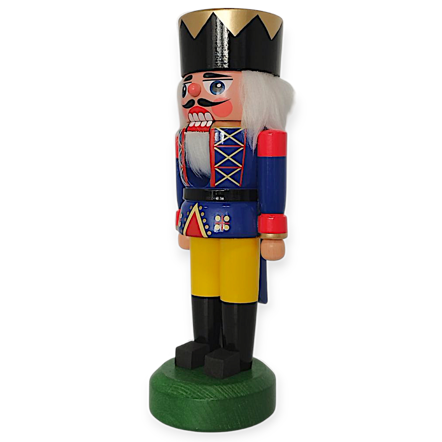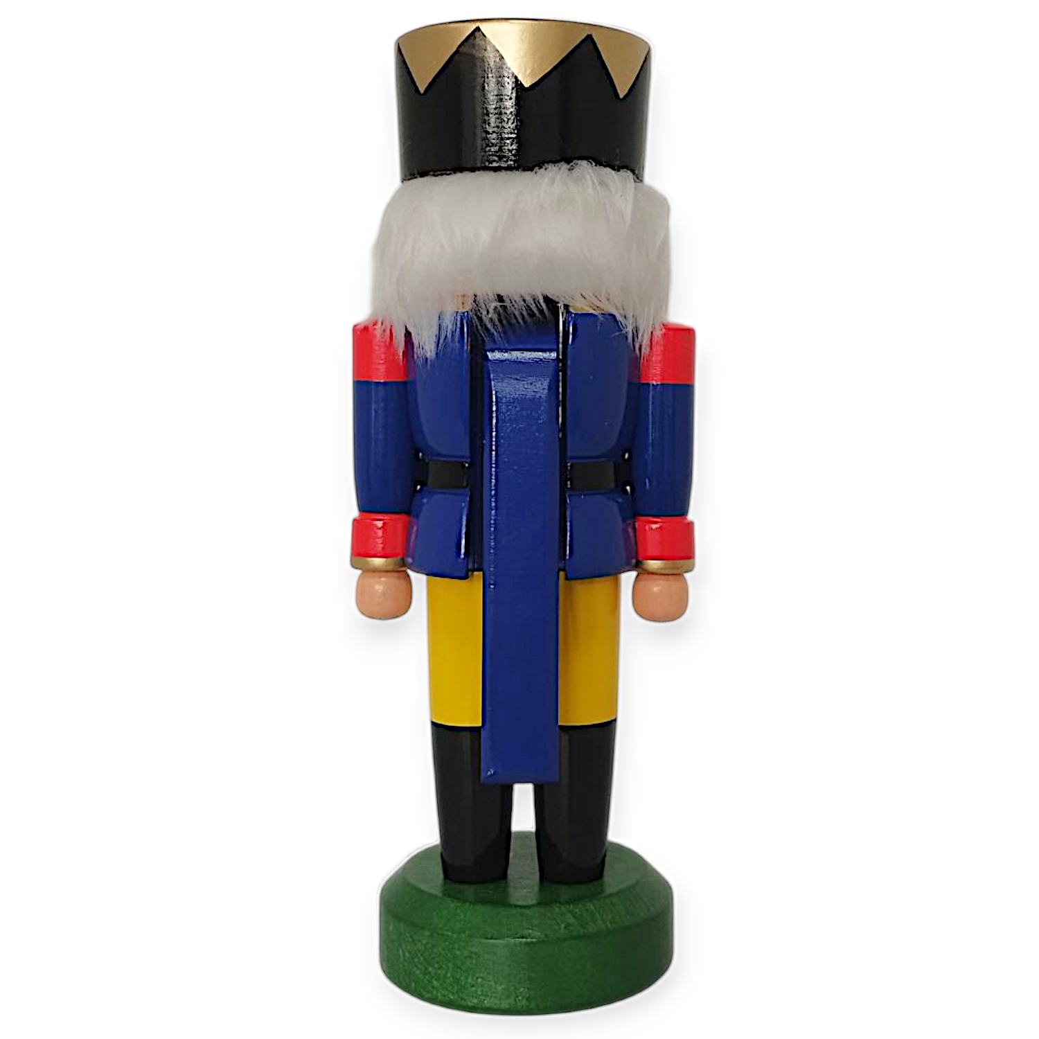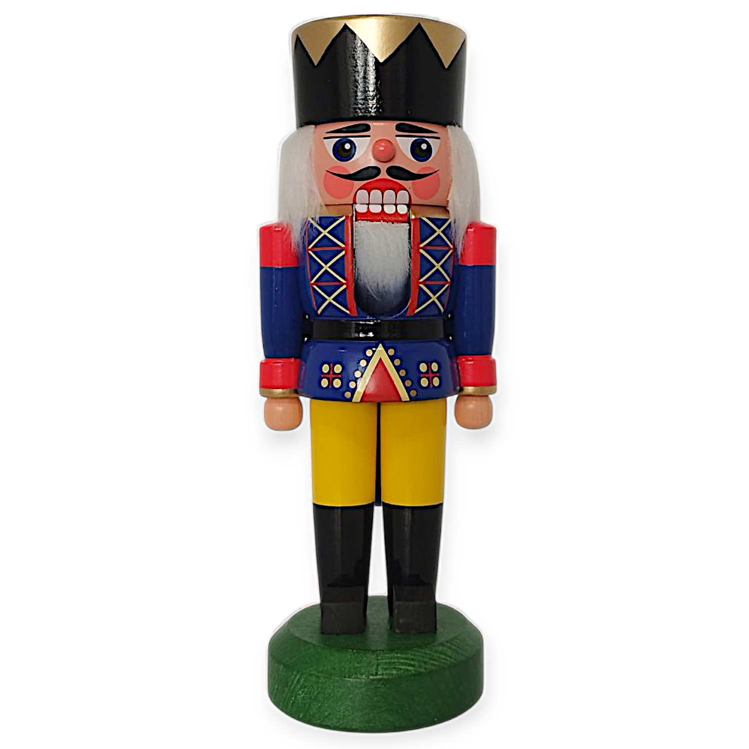 Der kleine Nussknacker-König steht würdevoll und aufrecht auf einem satten, grün bemalten Rundsockel. Mit seiner prächtigen Erscheinung zieht er sofort die Blicke auf sich. Die kräftigen Farben seiner Bemalung – leuchtendes Blau, strahlendes Gelb, tiefes Schwarz und glänzendes Gold – unterstreichen seinen königlichen Rang. Sein blauer Rock reicht bis zur Hüfte und trägt ein kunstvoll aufgemaltes, goldenes Ziermuster mit einem blauen Dreieck auf der unteren Front, das an ein königliches Wappen erinnert. Roten Ärmelmanschetten und eine gleichfarbige Hose bilden einen auffälligen Kontrast zur dunklen Stiefelpartie.