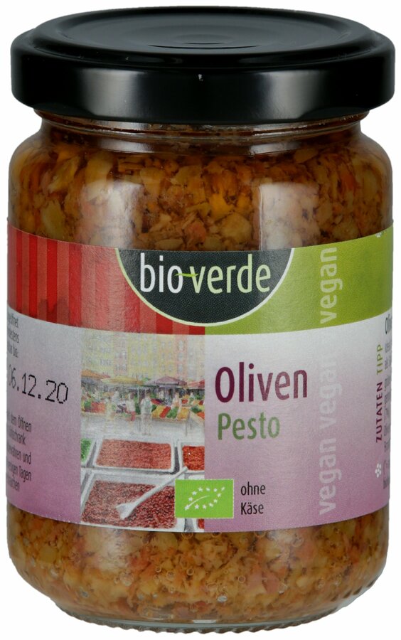 Das vegane bio-verde Oliven-Pesto ist eine würzige Sauce aus Oliven und sonnengetrockneten Tomaten.
