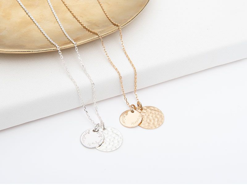 Schlicht und gradlinig – die handgravierte gehämmerte Münz Duo Halskette kann mit Ihren Worten personalisiert werden. Sie ist ein wunderbares Geschenk für jeden Anlass und ein Schmuckstück, das auf verschiedene Arten getragen werden kann & in keiner Schmucksammlung fehlen sollte.