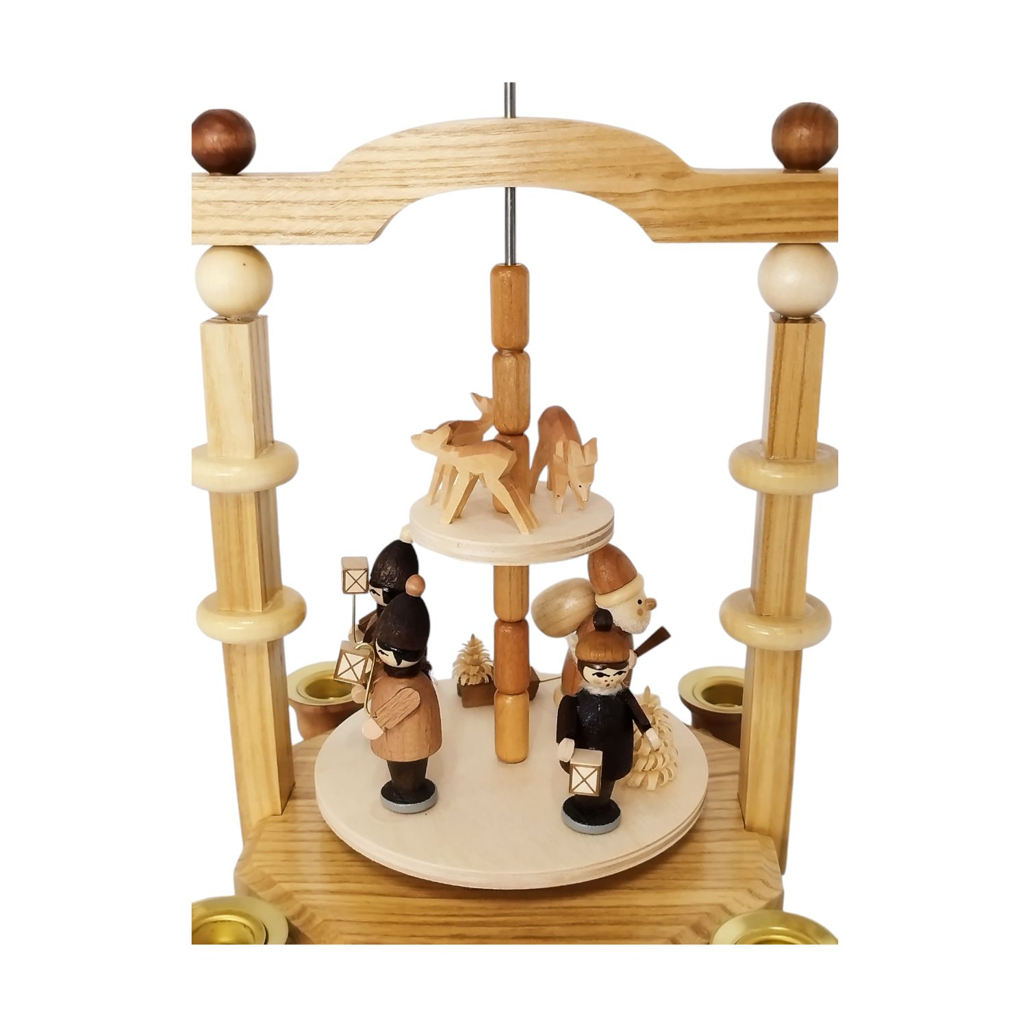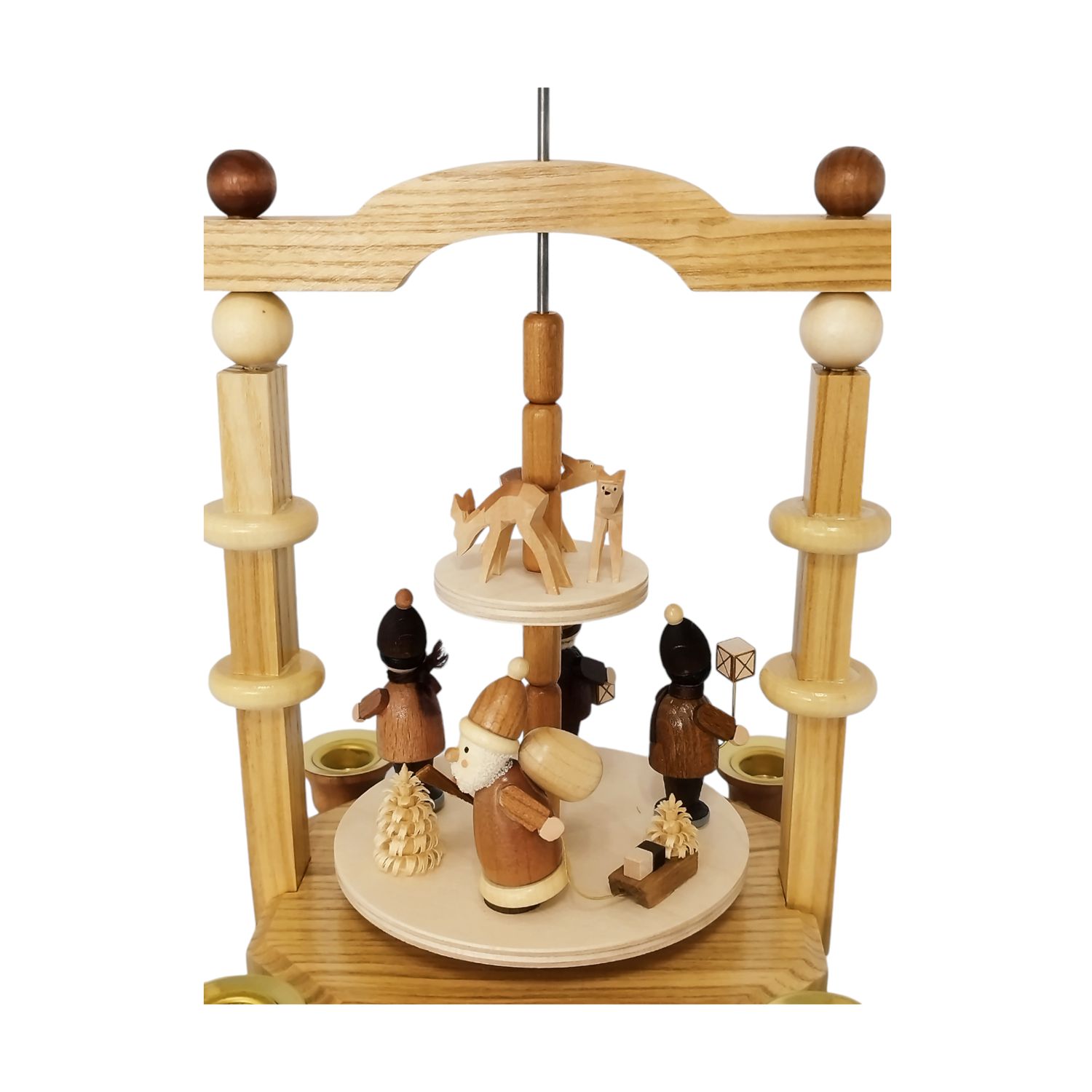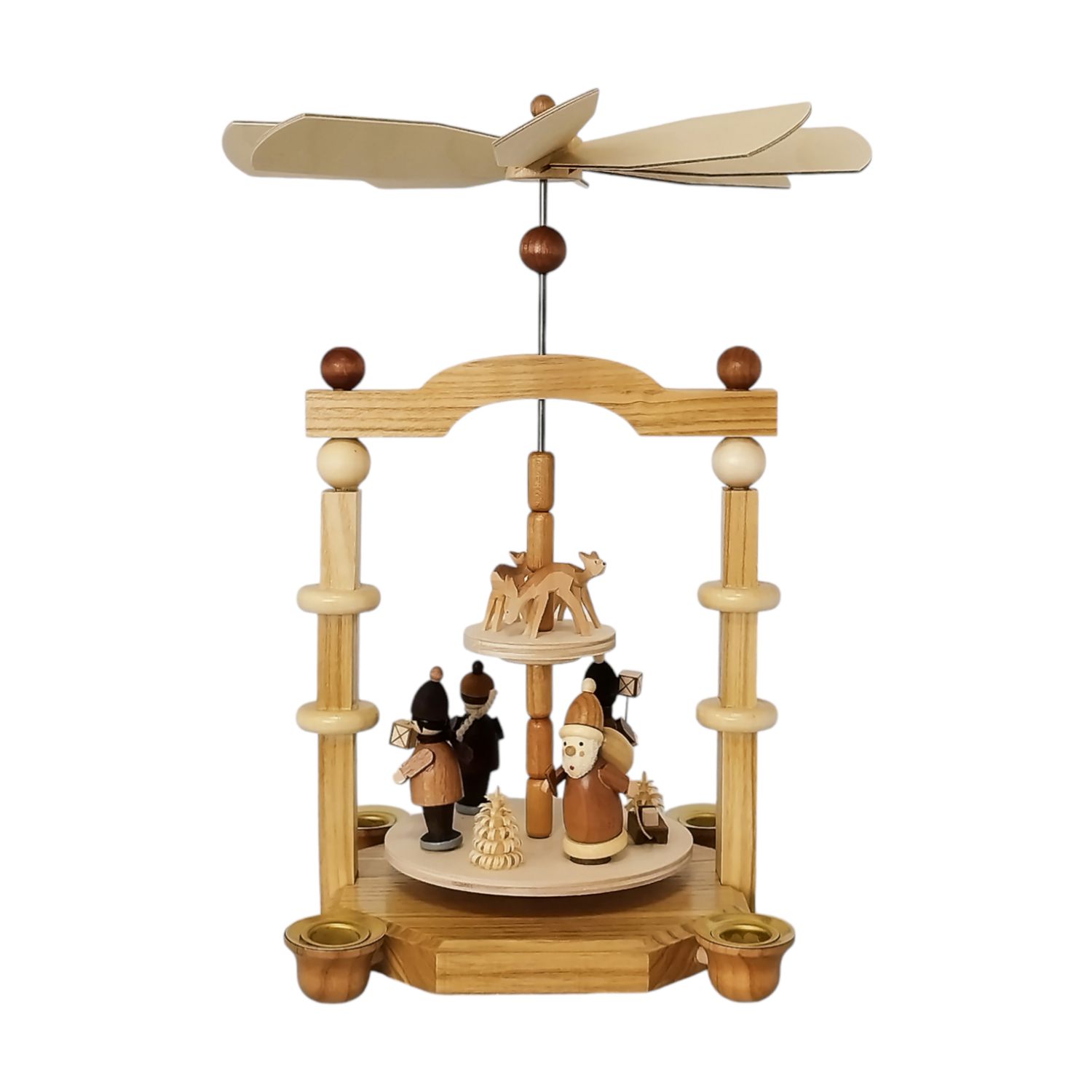 Die Pyramide ist komplett in natürlichen Holztönen gehalten und besteht aus zwei Etagen. Oben auf der Pyramide befindet sich das Flügelrad welches durch die aufsteigende Wärme der Kerzen in Bewegung gesetzt werden. Die obere Etage ist schlicht gestaltet und beherbergt drei handgeschnitzte Rehe, die in einem Dreieck angeordnet sind.