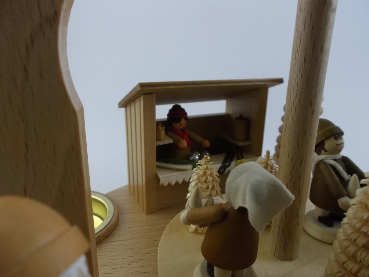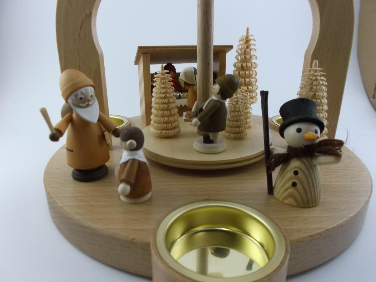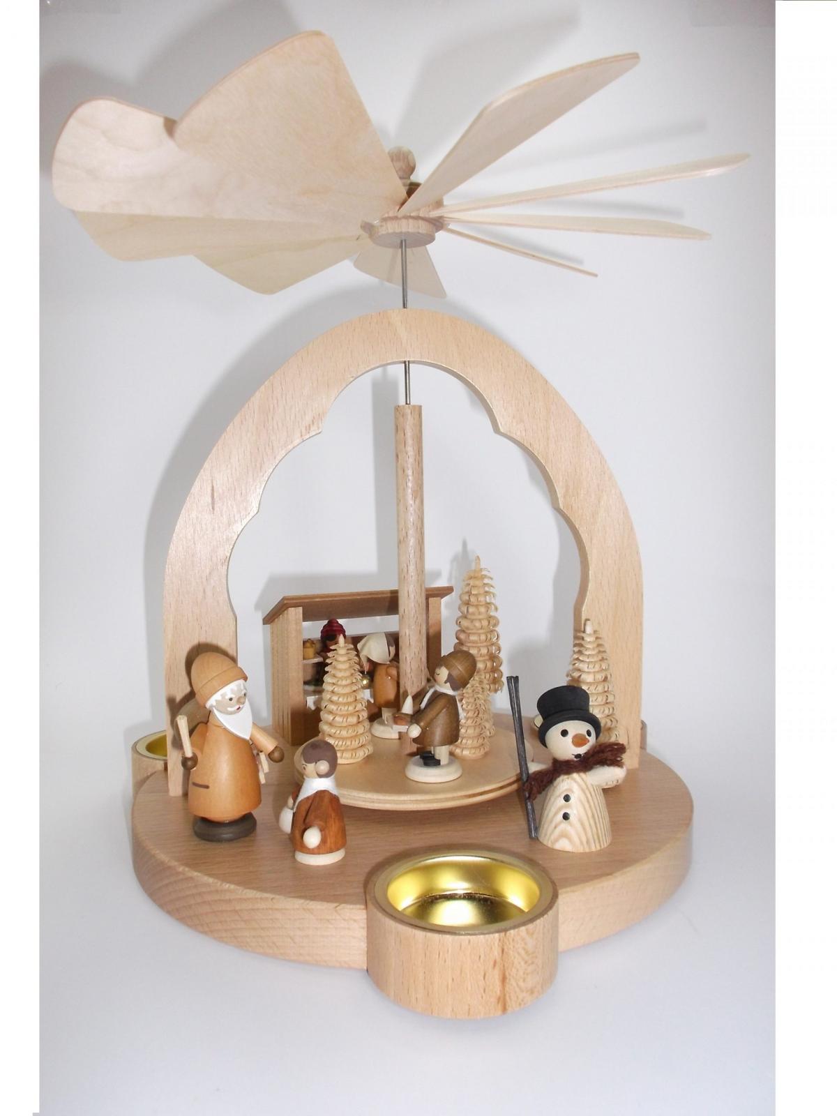 Eine schöne naturbelassene Pyramide Weihnachtsmarkt mit Striezelkinder, natur für Teelichter. Eine kleine Weihnachtsmarktbude steht am Rand, Striezelkinder sind unterwegs, ein Schneemann und der Nikolaus bezaubern neben den kleinen Spanbäumchen.