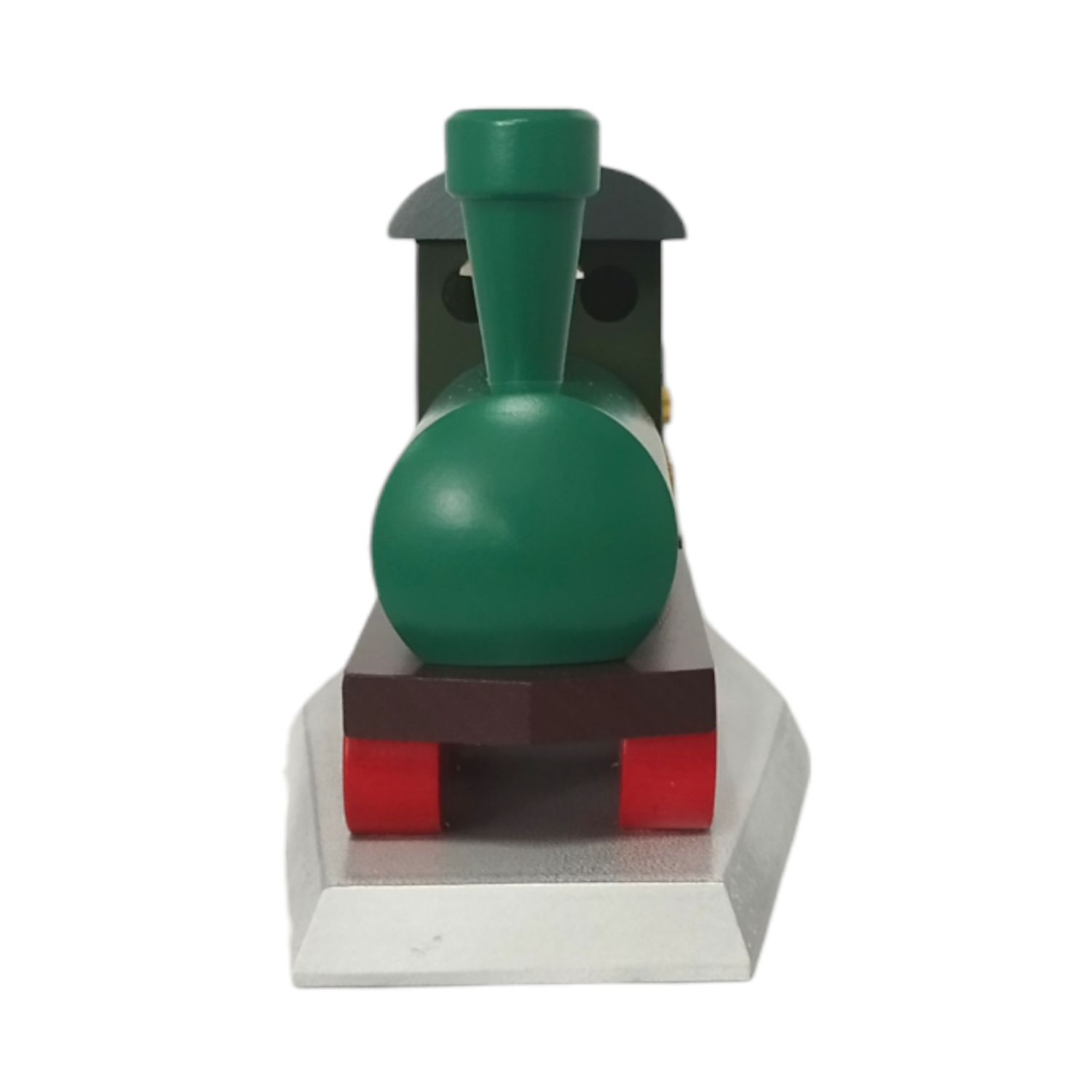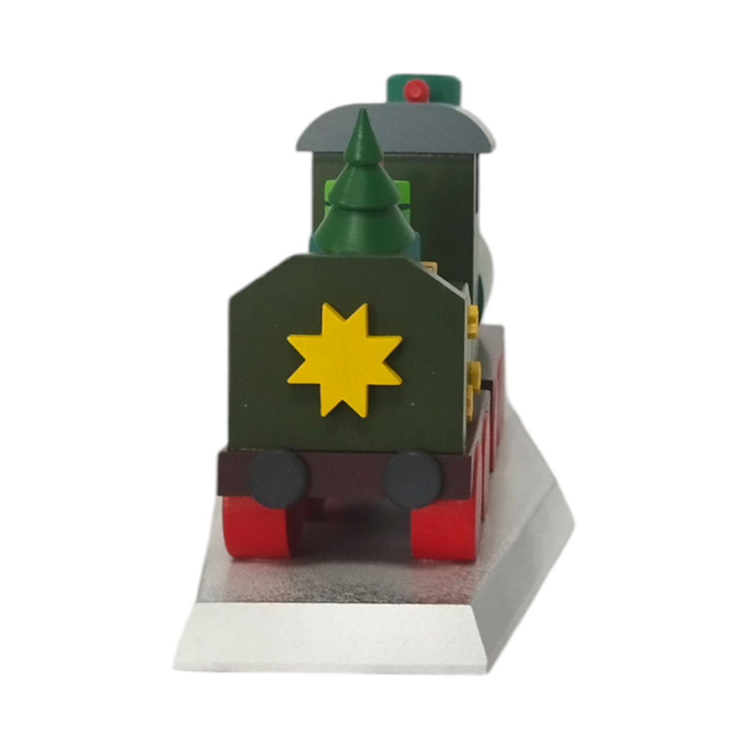 Die Räder der Lokomotive und des Wagens sind in einem kräftigen Rot gestrichen und mit feinen Details versehen, die an die Speichen eines echten Zugrades erinnern. Diese roten Räder bilden einen schönen Kontrast zu den grünen und goldenen Elementen des Zugs und sorgen für eine harmonische Farbkomposition.