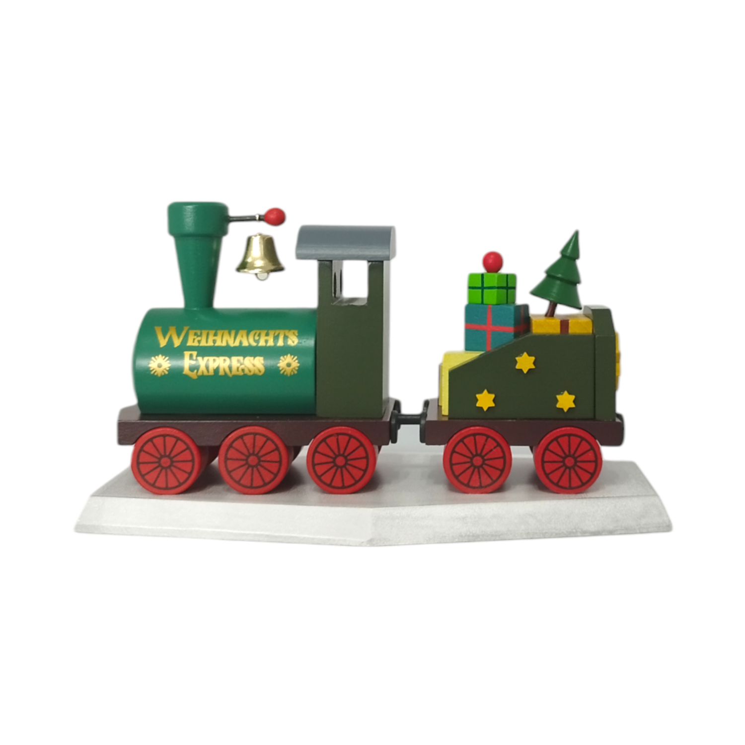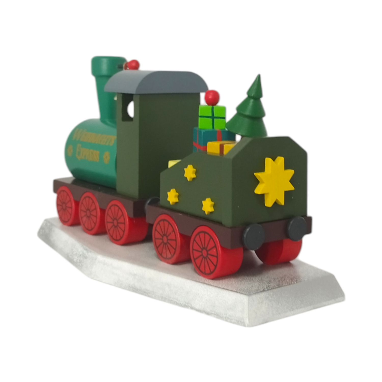 Der Wagen hinter der Lokomotive ist ebenfalls grün sowie reich beladen. Er ist vollgepackt mit bunten Geschenken in verschiedenen Farben sowie Größen, die sorgsam gestapelt sind. Diese Geschenke sind in leuchtenden Farben wie Rot, Blau, Gelb und Grün bemalt, und einige sind mit Schleifen verziert. Zusätzlich zu den Geschenken steht auf dem Wagen ein kleiner, grüner Tannenbaum. Der Wagen ist auch mit kleinen gelben Sternen dekoriert, die dem Zug ein zusätzliches festliches Aussehen verleihen.