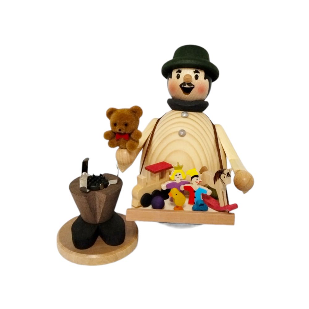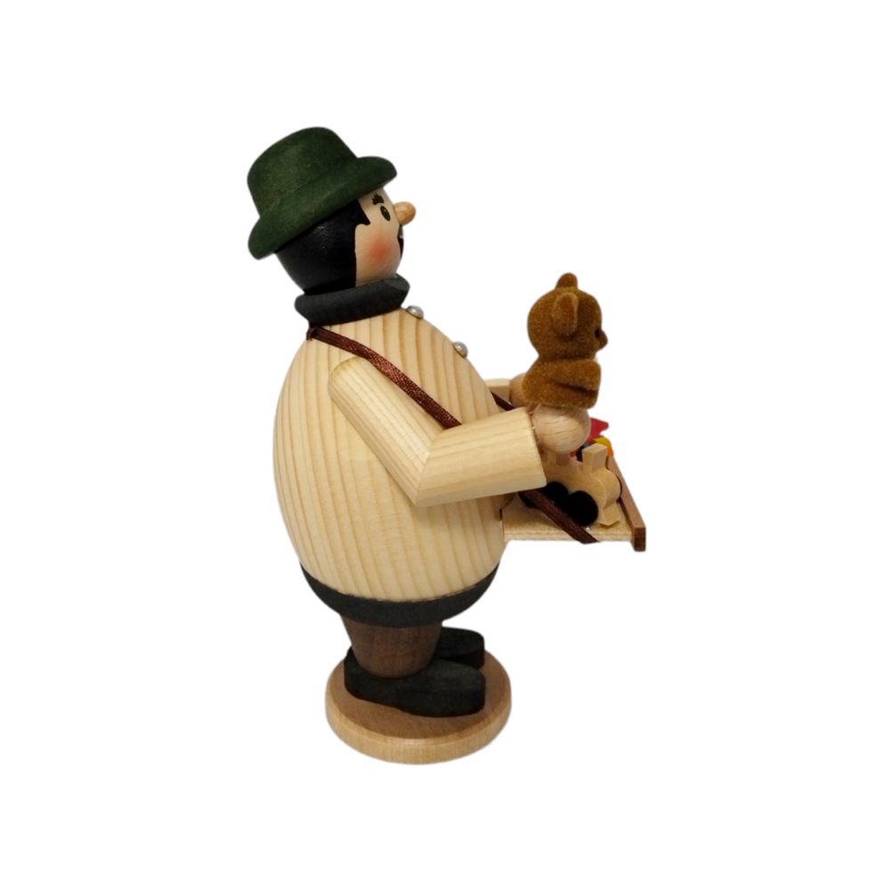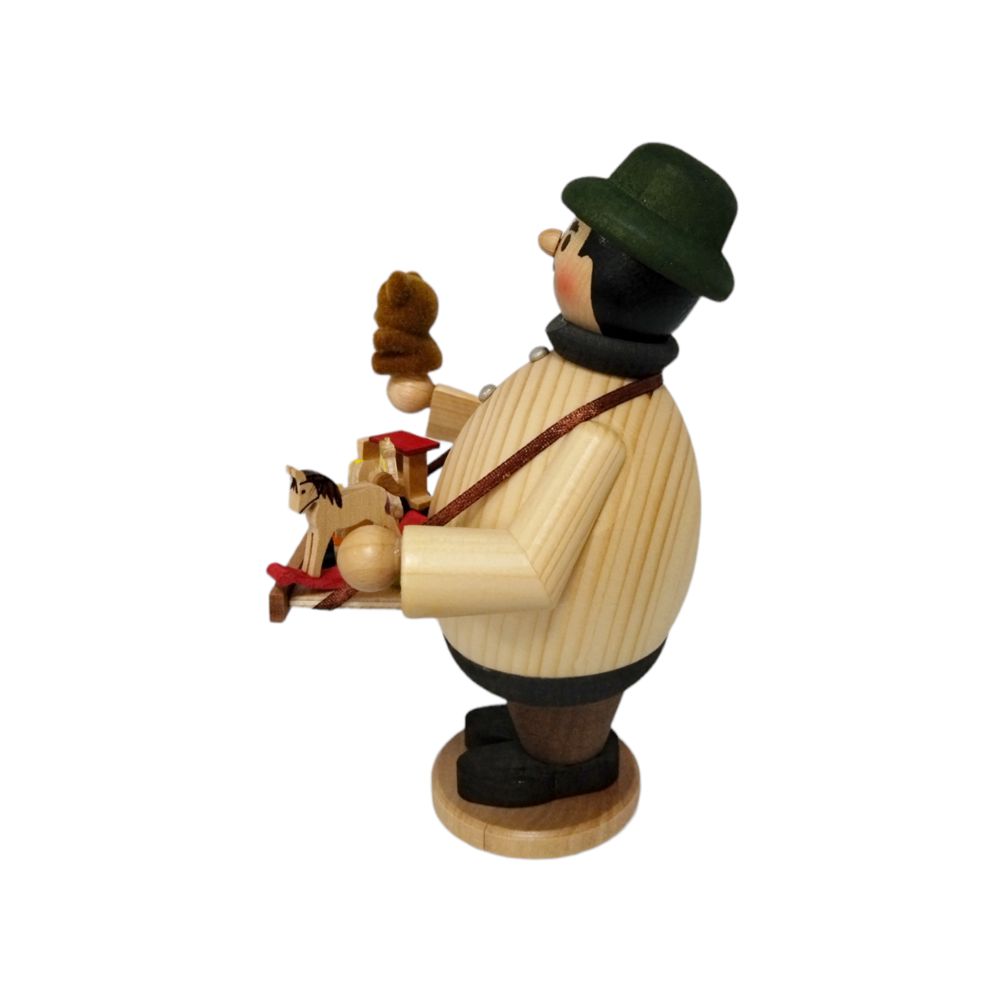 Dieser Räuchermann Max als Spielzeugverkäufer wird in liebevoller sowie traditioneller Handarbeit von der Drechslerei Kuhnert gefertigt.