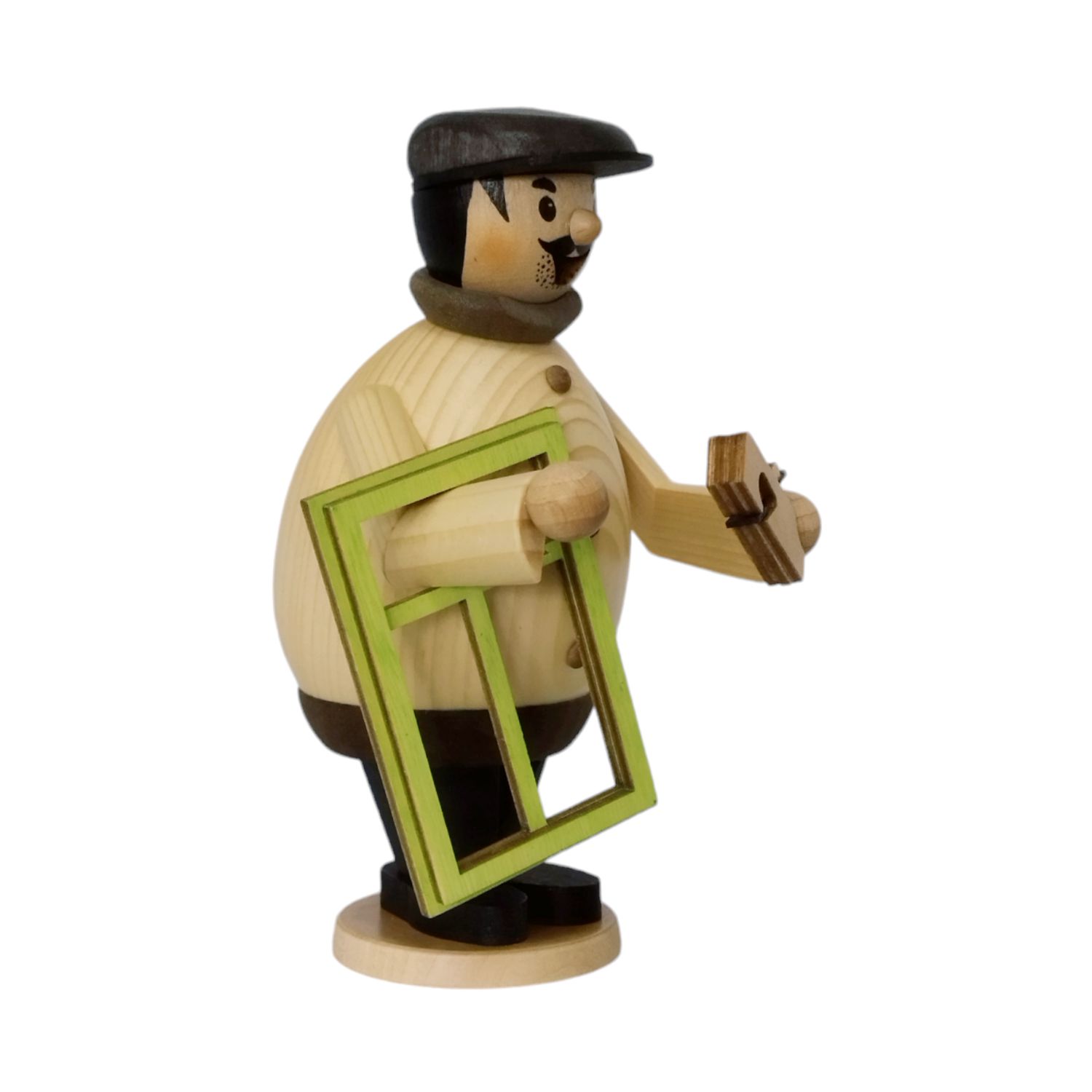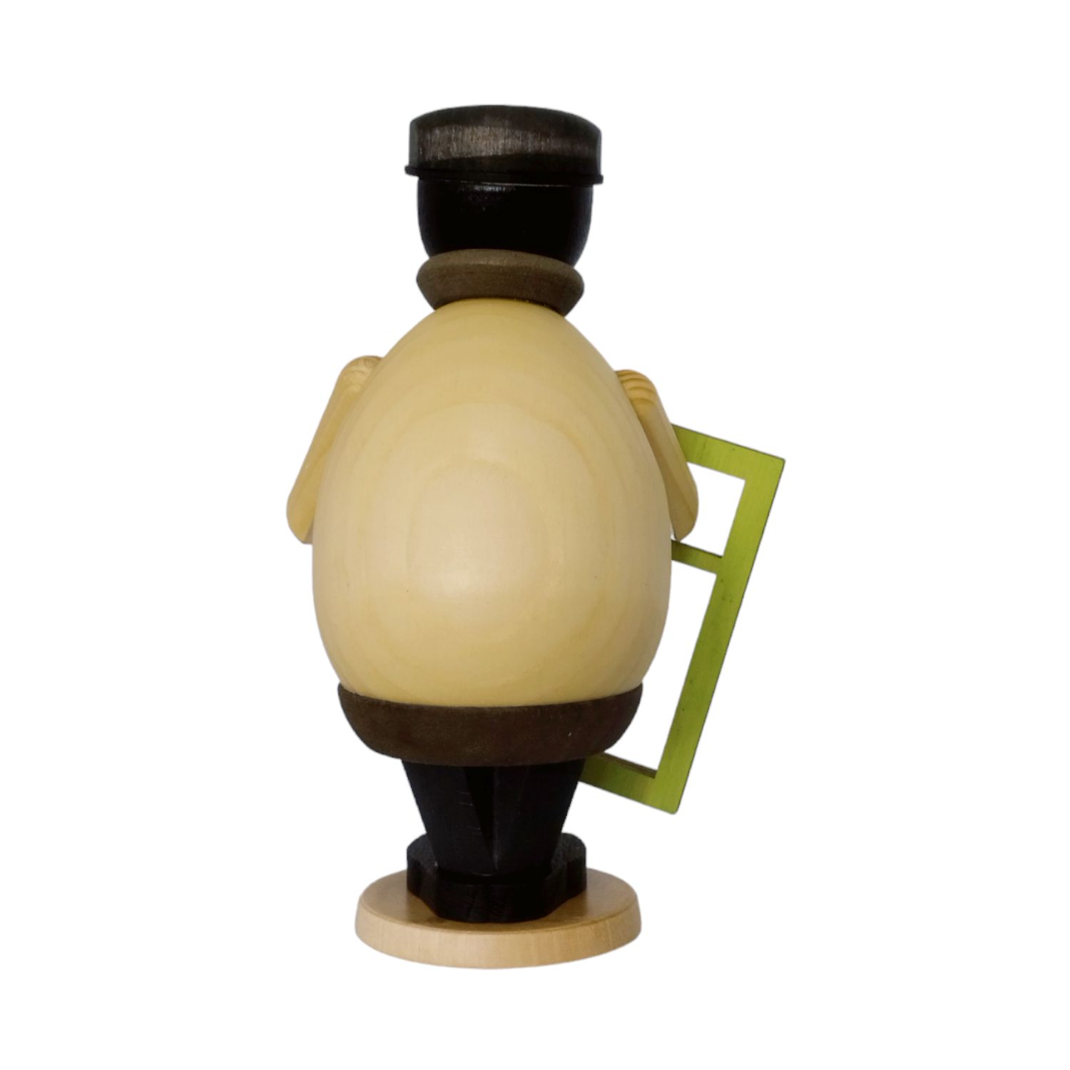 Max ist ein vielseitiger Charakter, der gerne verschiedene Rollen annimmt. Heute präsentiert er sich als Tischler. Max hat eine runde, kompakte Form und sein Oberteil ist natur gelassen, so kommt die natürliche Maserung des Holzes wunderschön zur Geltung, sein runder Bauch wird von schwarzen Knöpfen geziert. In der Hand hält er einen selbstgebauten, grünen Fensterrahmen sowie Allerlei Werkzeug welches für seinen Alltag als Tischler unerlässig ist.