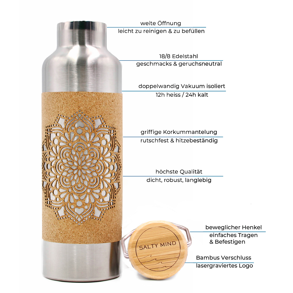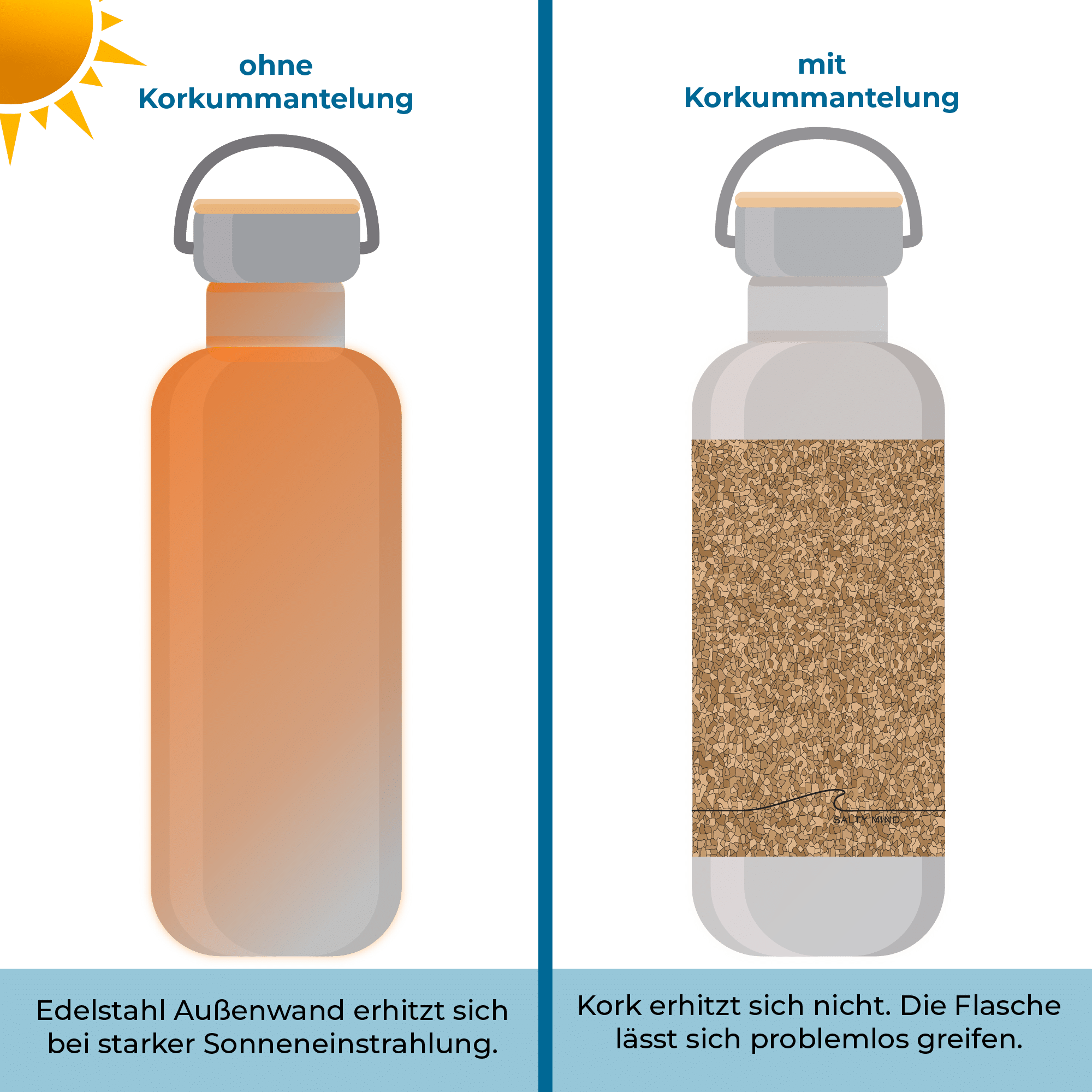 Der griffige Kork der Salty Mind Flasche sieht nicht nur gut aus. Er bringt viele Vorteile mit sich. Kork wirkt temperaturregulierend. So erhitzt sich die Salty Mind Edelstahl-Flasche bei Sonneneinstrahlung nicht und Im Winter bleiben deine Finger nicht am kalten Edelstahl kleben. Sie lässt sich zu jeder Witterung gut angreifen. Kork, als nachwachsende Ressource, ist ein wahres Wundermaterial. Rutschfest liegt die Flasche immer perfekt in der Hand. Wasserabweisend nimmt der Kork den Schweiß und Gerüche jedoch nicht auf! Ganz im Gegenteil: anti-mikrobiell wird das Wachstum geruchsbildender Bakterien gehemmt.