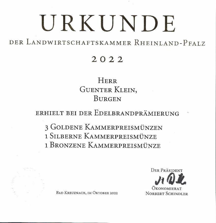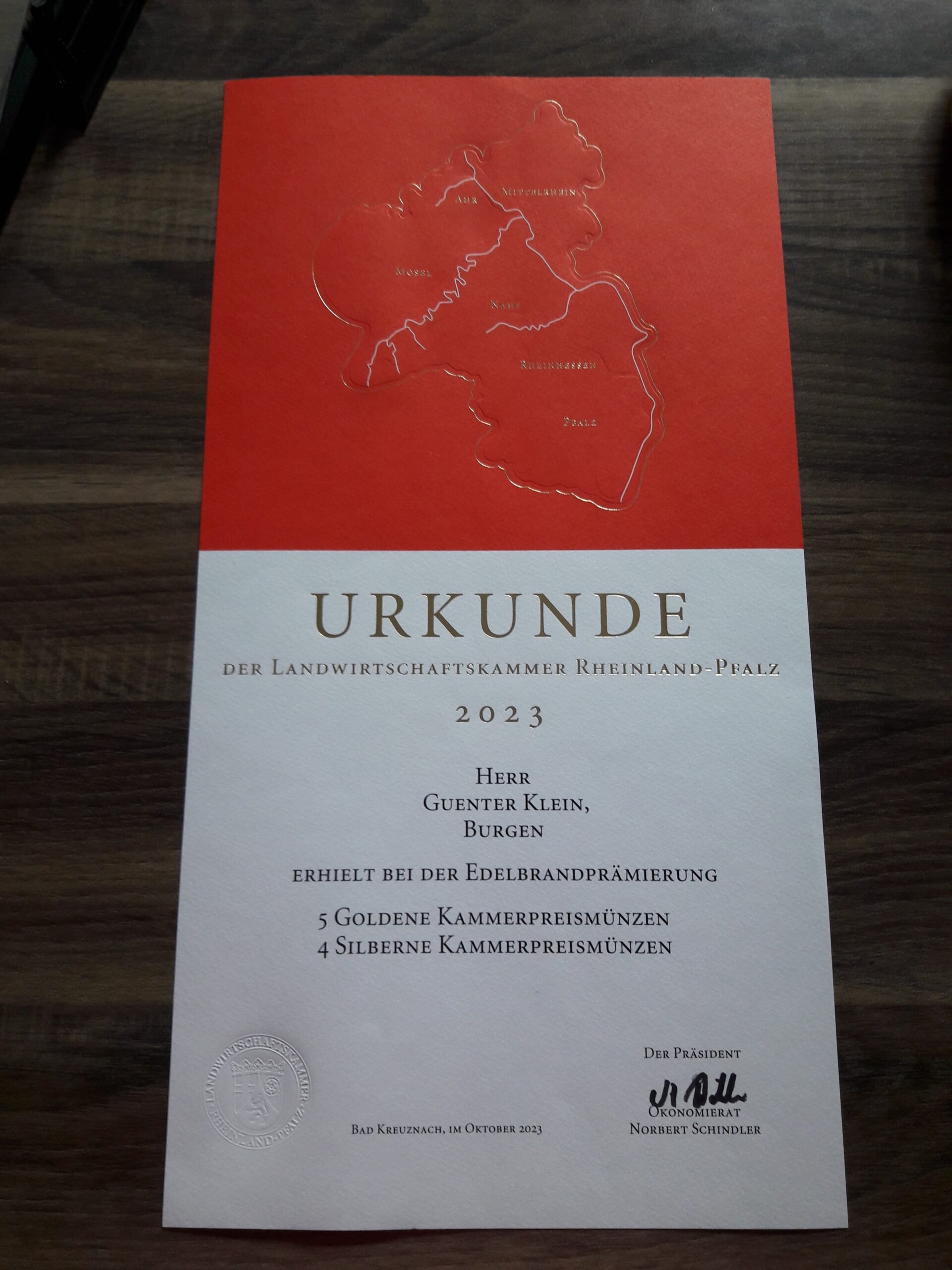 Silberne Kammerpreismünze bei der der Edelbrand-Prämierung 2023 der Landwirtschaftskammer Rheinland-Pfalz