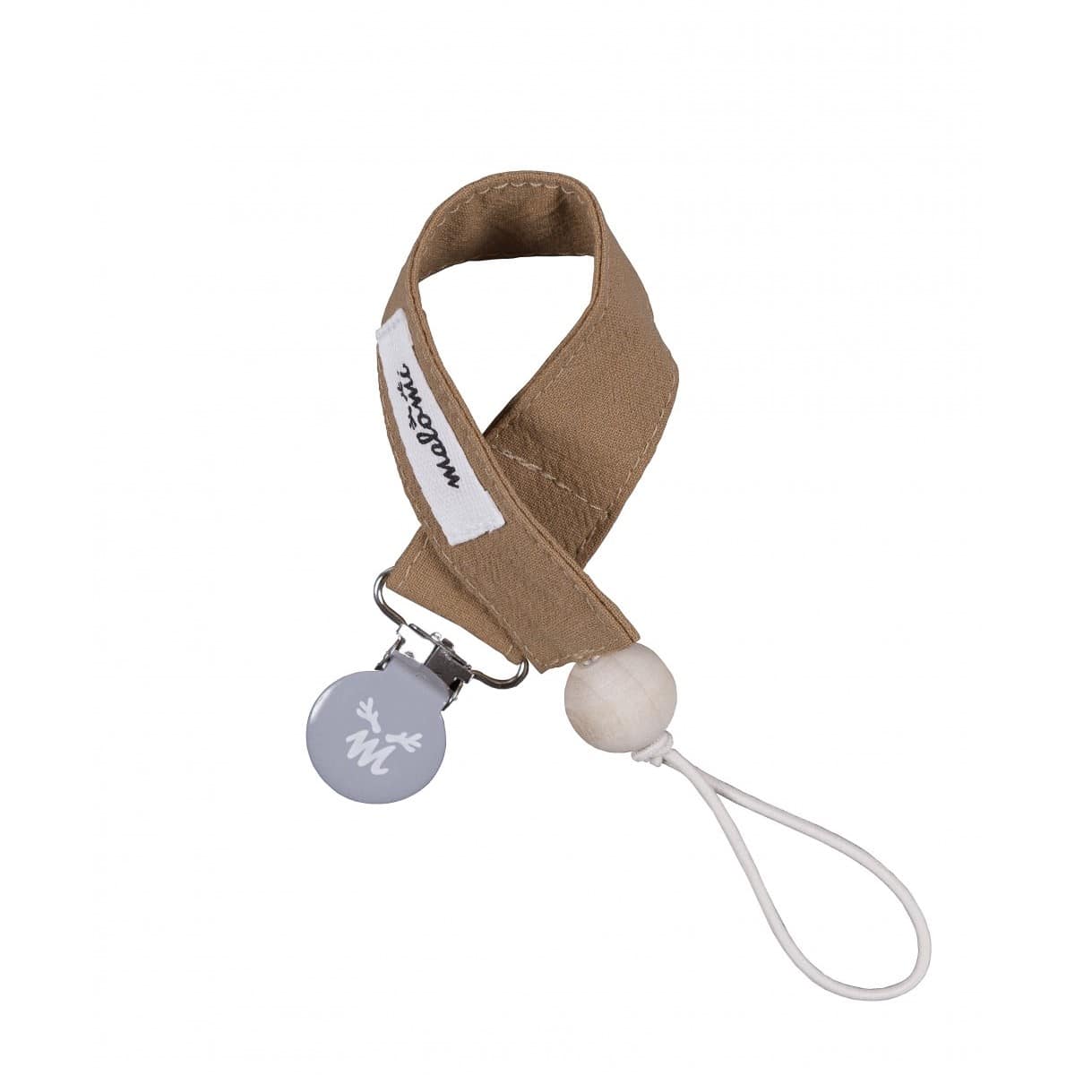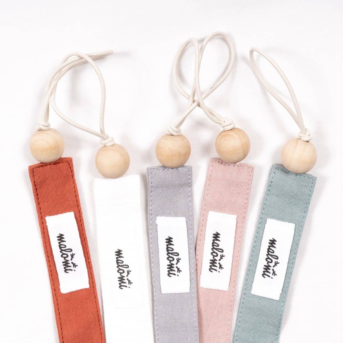 Praktischer Schnulleranhänger aus gewaschenem Baumwollstoff und dekorativer Holzperle.