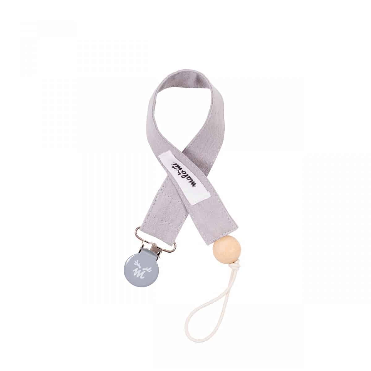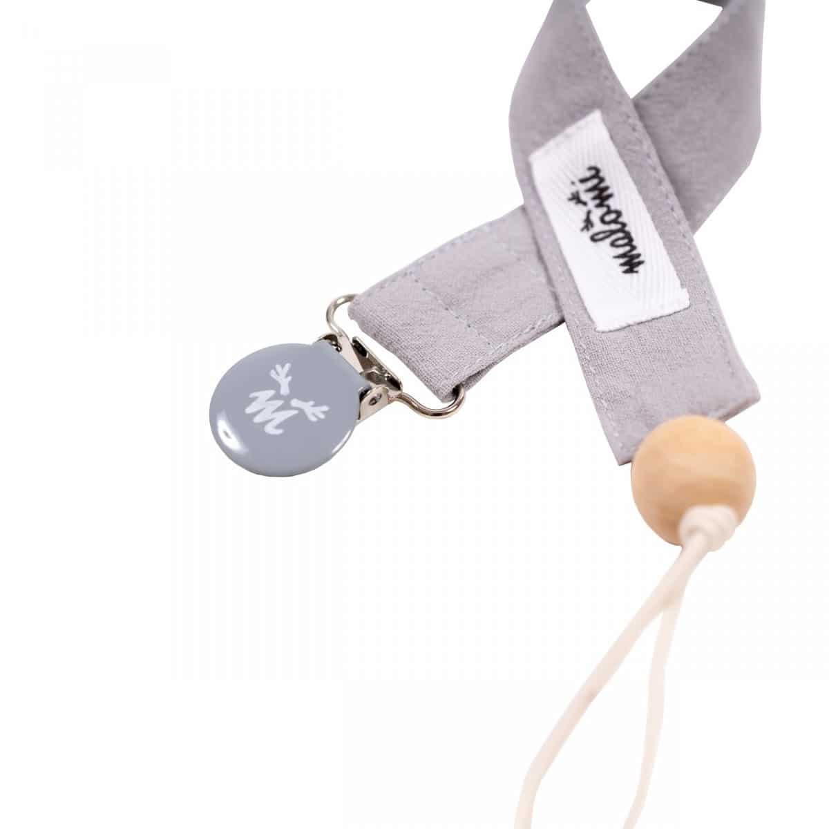 Praktischer Schnulleranhänger aus gewaschenem Baumwollstoff und dekorativer Holzperle.
