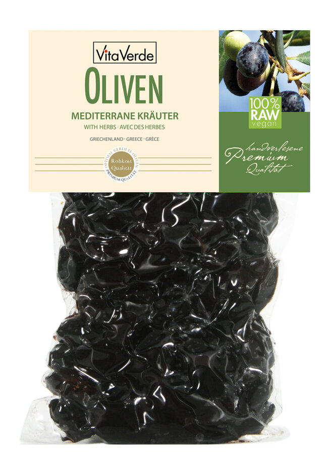 Schwarze Bio-Oliven, von Hand selektiert, luftgetrocknet, ohne zusätzliche Flüssigkeit und mit erlesenen Kräutern veredelt. Ursprünglicher, authentischer Geschmack. 100 % Rohkostqualität. Ideal als Snack zwischendurch.