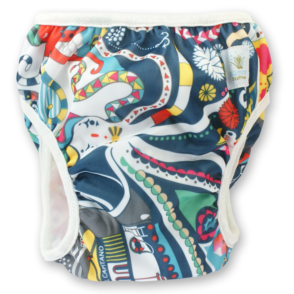 Leichte Schwimmwindel aus PUL mit einem weichen Futter aus Polyestermesh, das sich nicht vollsaugt und die Windel im Wasser leicht hält.