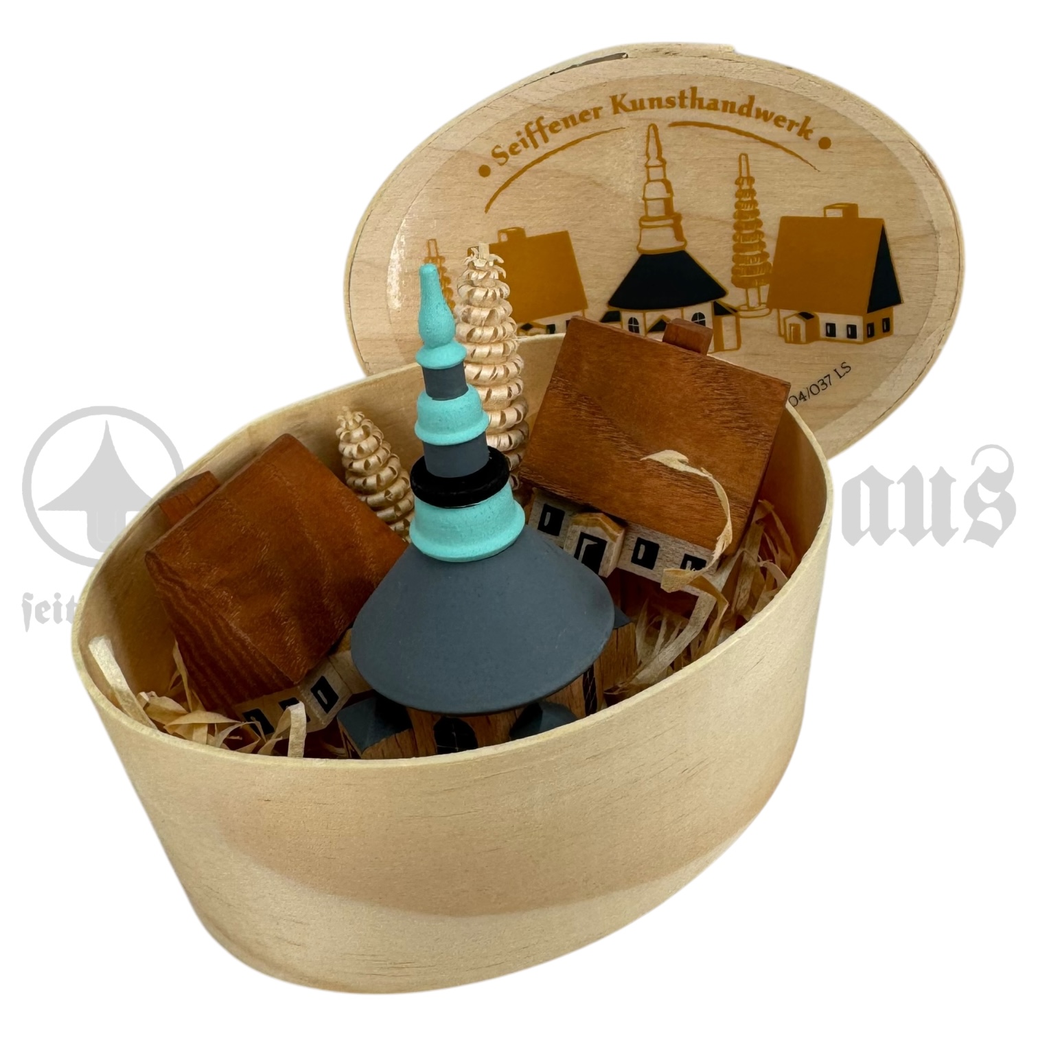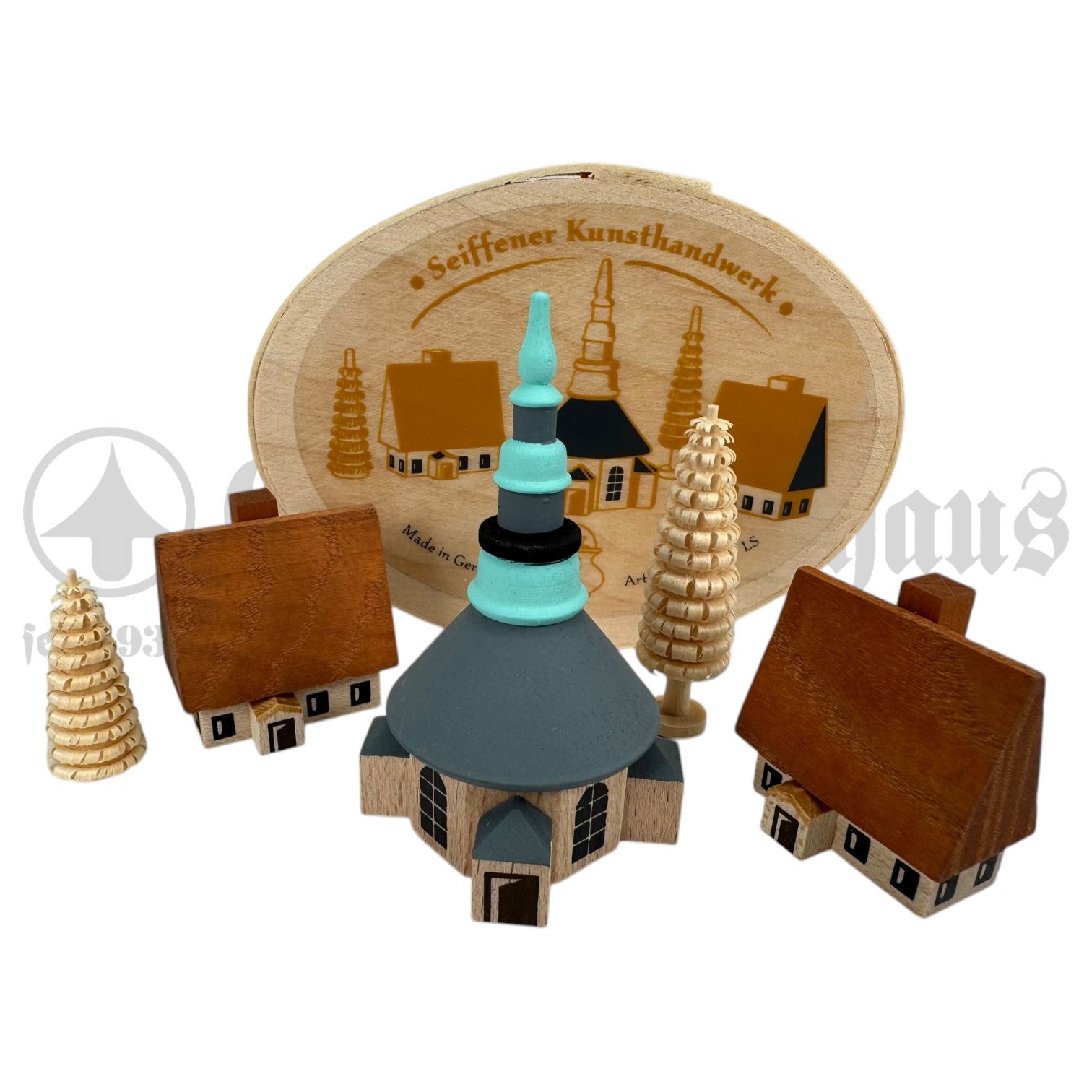- Seiffener Kirche mit Häusern und Bäumen in der Spanschachtel